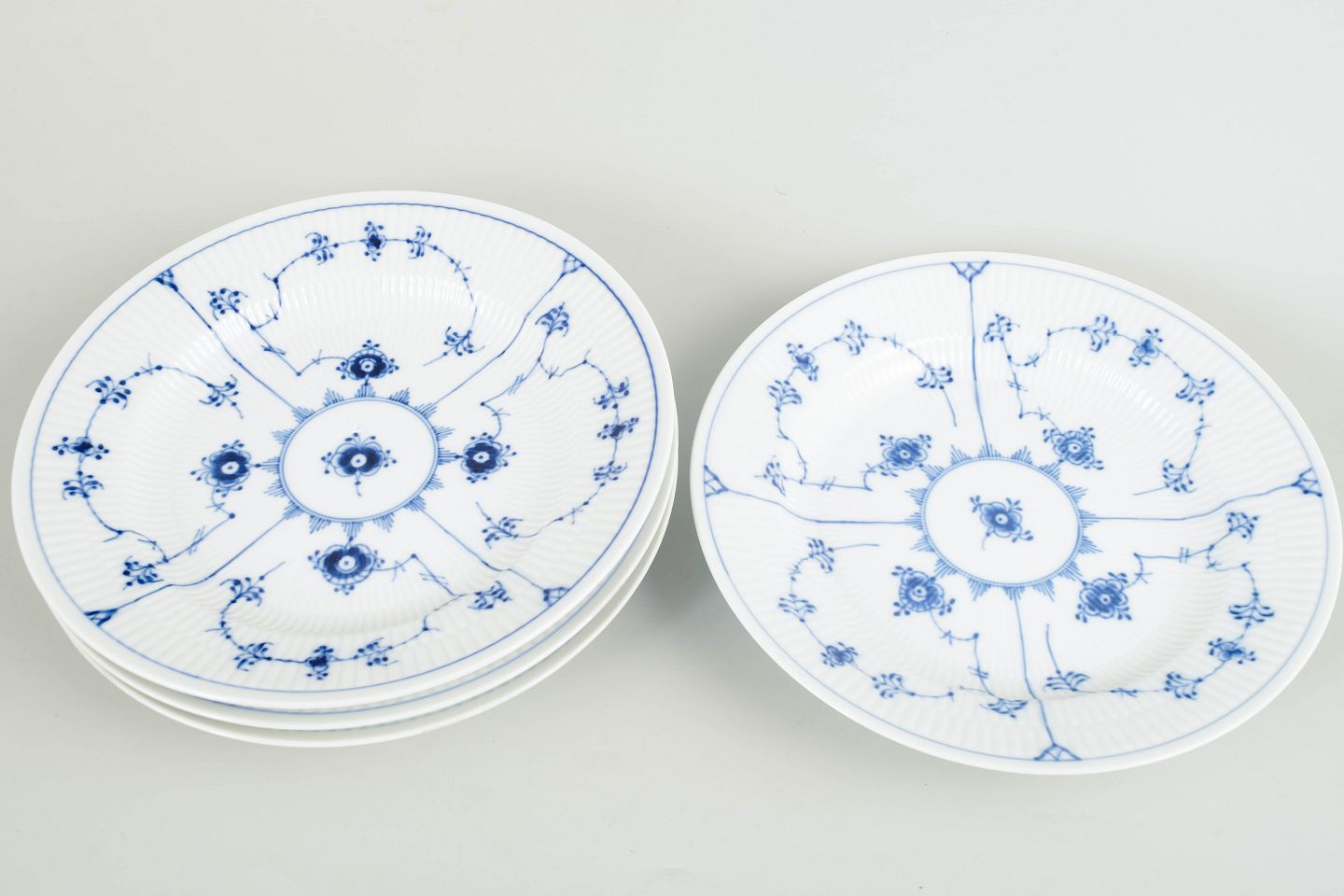 Set of 4 dinner plates in white porcelain decorated with hand-painted cobalt blue Blue Fluted Plain pattern. Model 1/575.