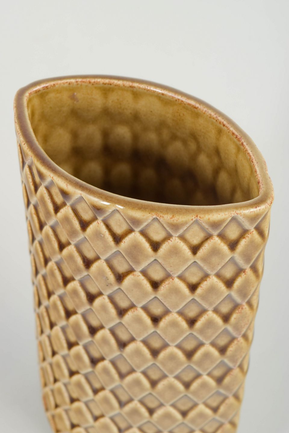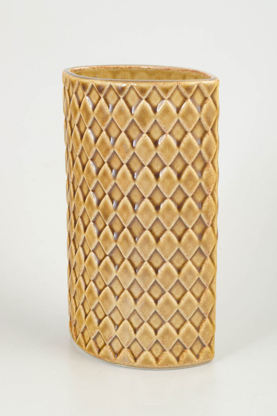 Cylindrical ceramic vase with a relief patterned Harlekiini surface and a warm yellow-brown glaze. The Harlekiini model is known for its tactile diamond relief that creates a lively interplay of light across the glazed surface.