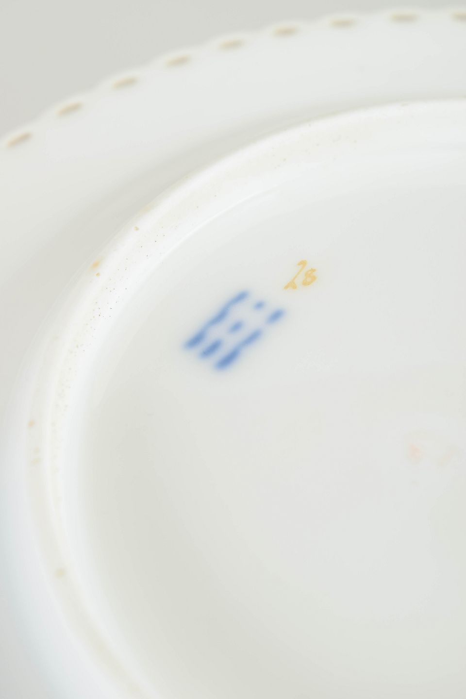 Hand-painted porcelain plates with an openwork rim and naturalistic decoration featuring a thistle motif. Executed with refined colour nuances and discreet gilding, characteristic of Royal Copenhagen’s 19th-century production.