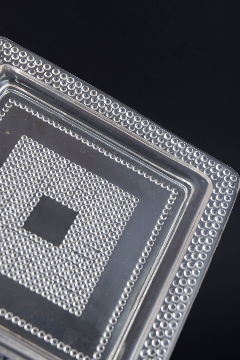 Set of three square plates in clear art glass with geometric relief and a defined central field. Pressed glass.