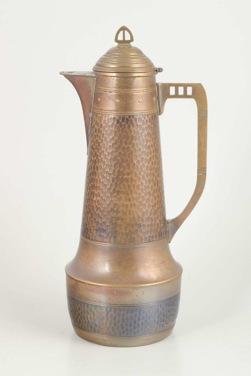 Tall conical coffee pot executed in hammered copper with a stepped foot, curved spout and geometric handle. The lid features a turned finial with integrated hinge. A classic example of early 20th-century Jugendstil design.