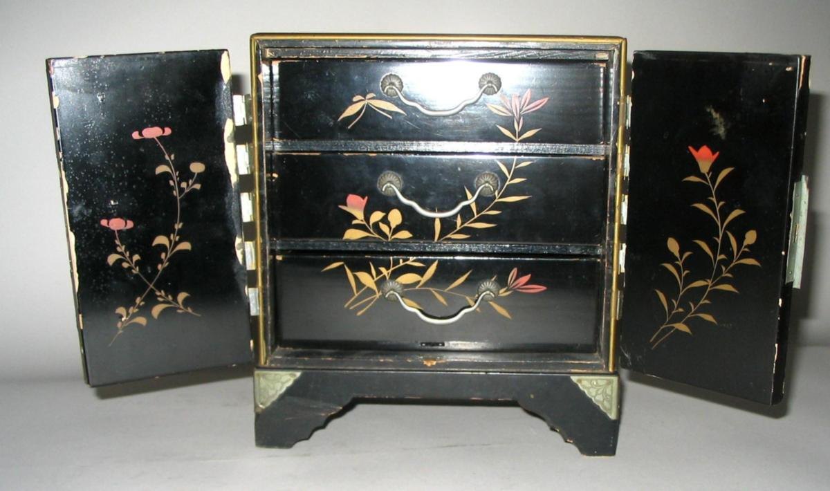 Chinese jewelry box in lacquer work with decorations in the form of birds on branches with berries. With two doors; inside with three drawers - also with decorations. H.: 21 cm. D: 11 cm. W.: 19 cm. With a few chips.