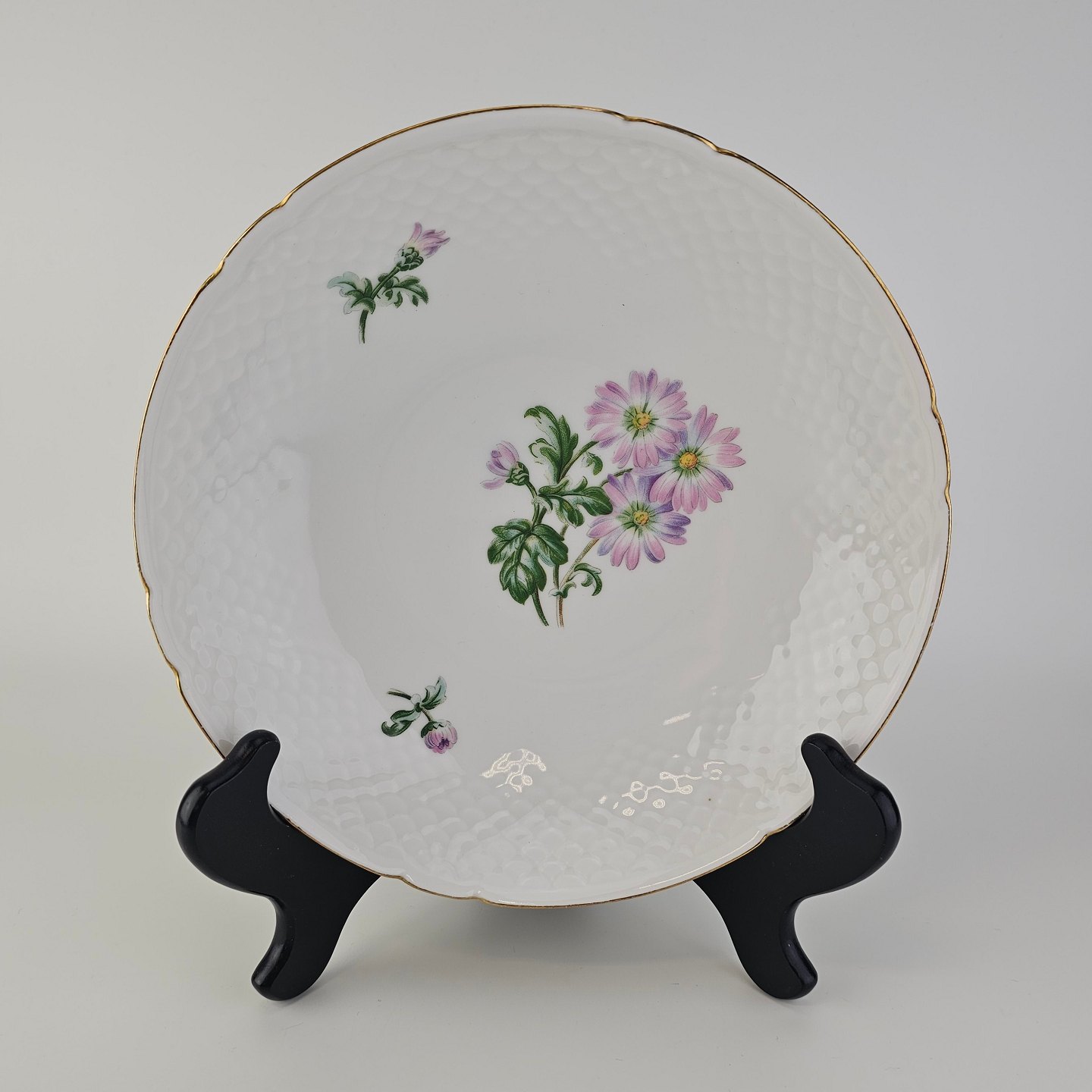 Krysantemum er hvidt porcelæn dekoreret med lys lilla blomst, grønne blade og guldkant.