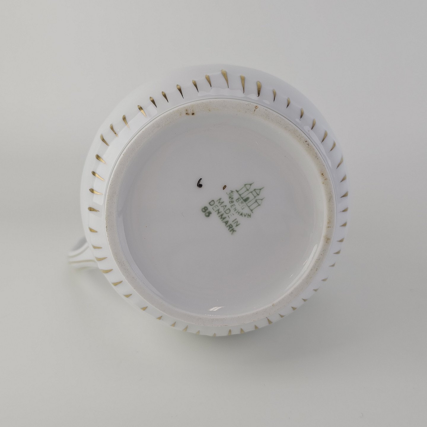 Krysantemum er hvidt porcelæn dekoreret med lys lilla blomst, grønne blade og guldkant.