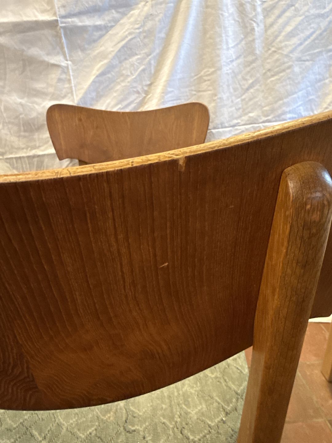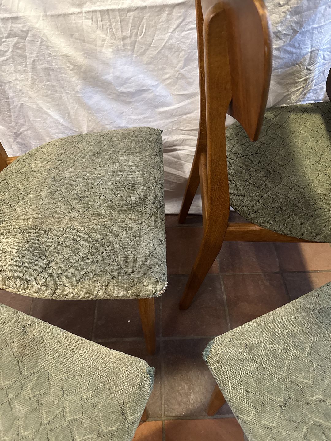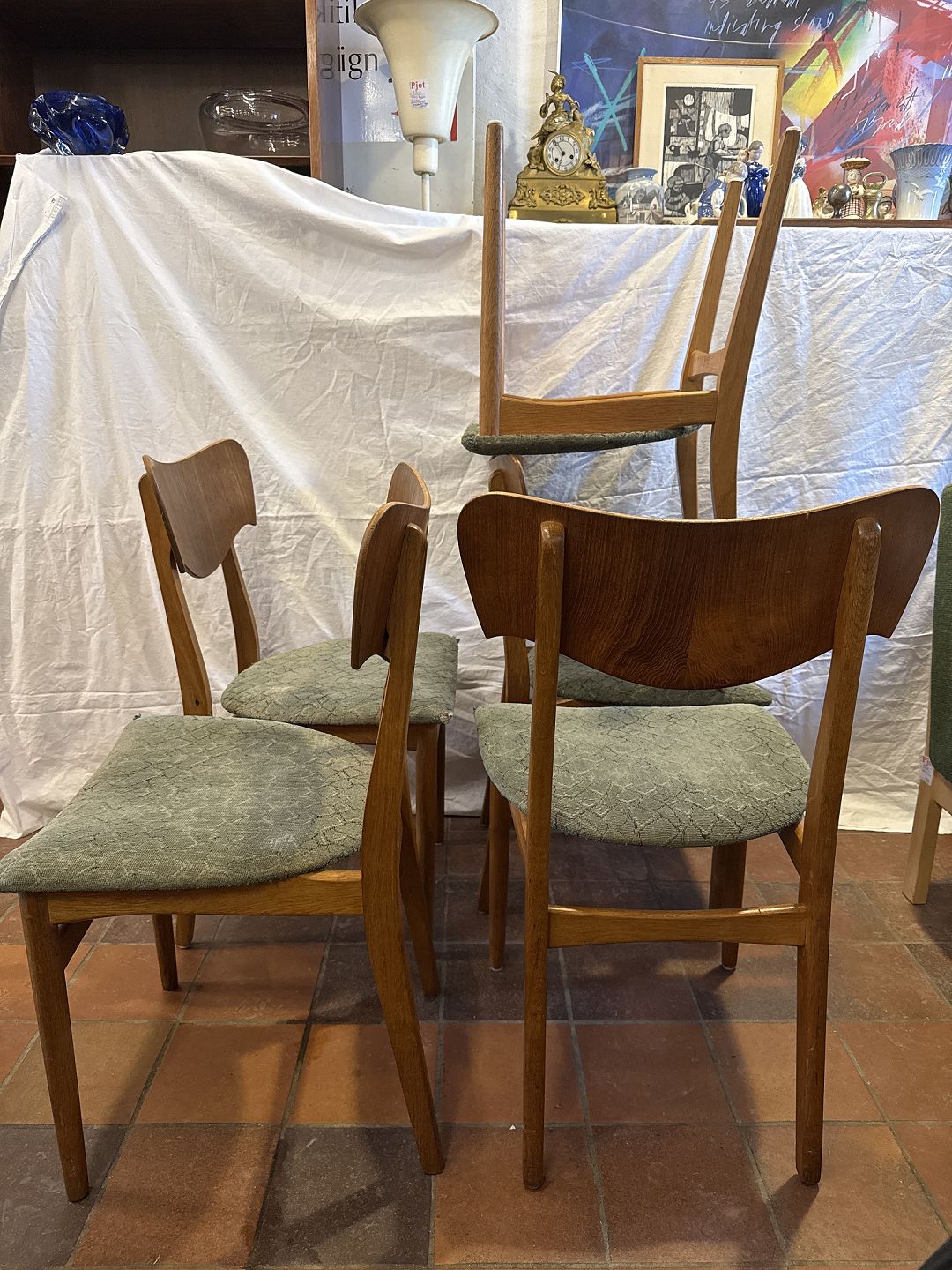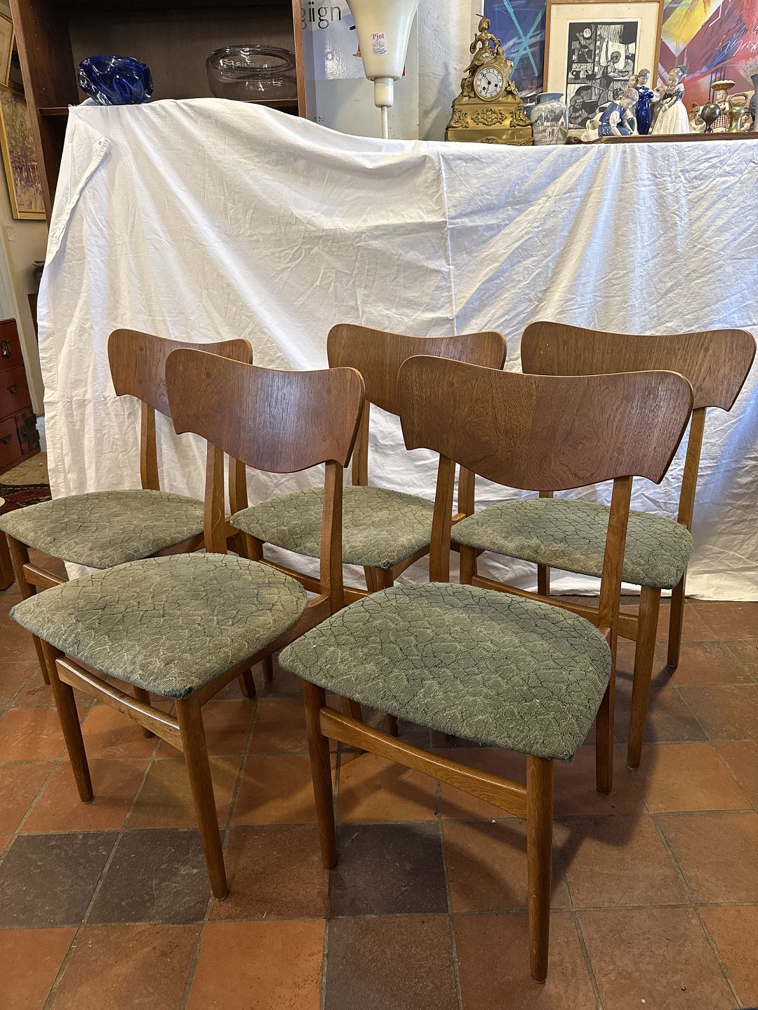 Text available in Danish: Dansk møbelproducent sæt af 5 spisestuestole i eg m. rygstykke i fineret teak samt sæde betrukket med stof. Fremstillet ca. 1950'erne.