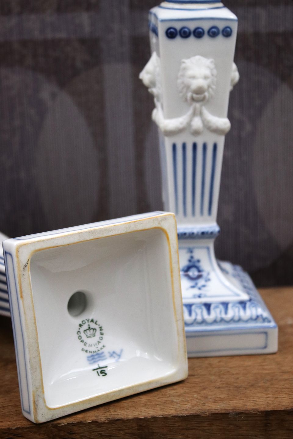 A pair of Royal Copenhagen Blue Fluted Fluted candlesticks "lion candlesticks"...