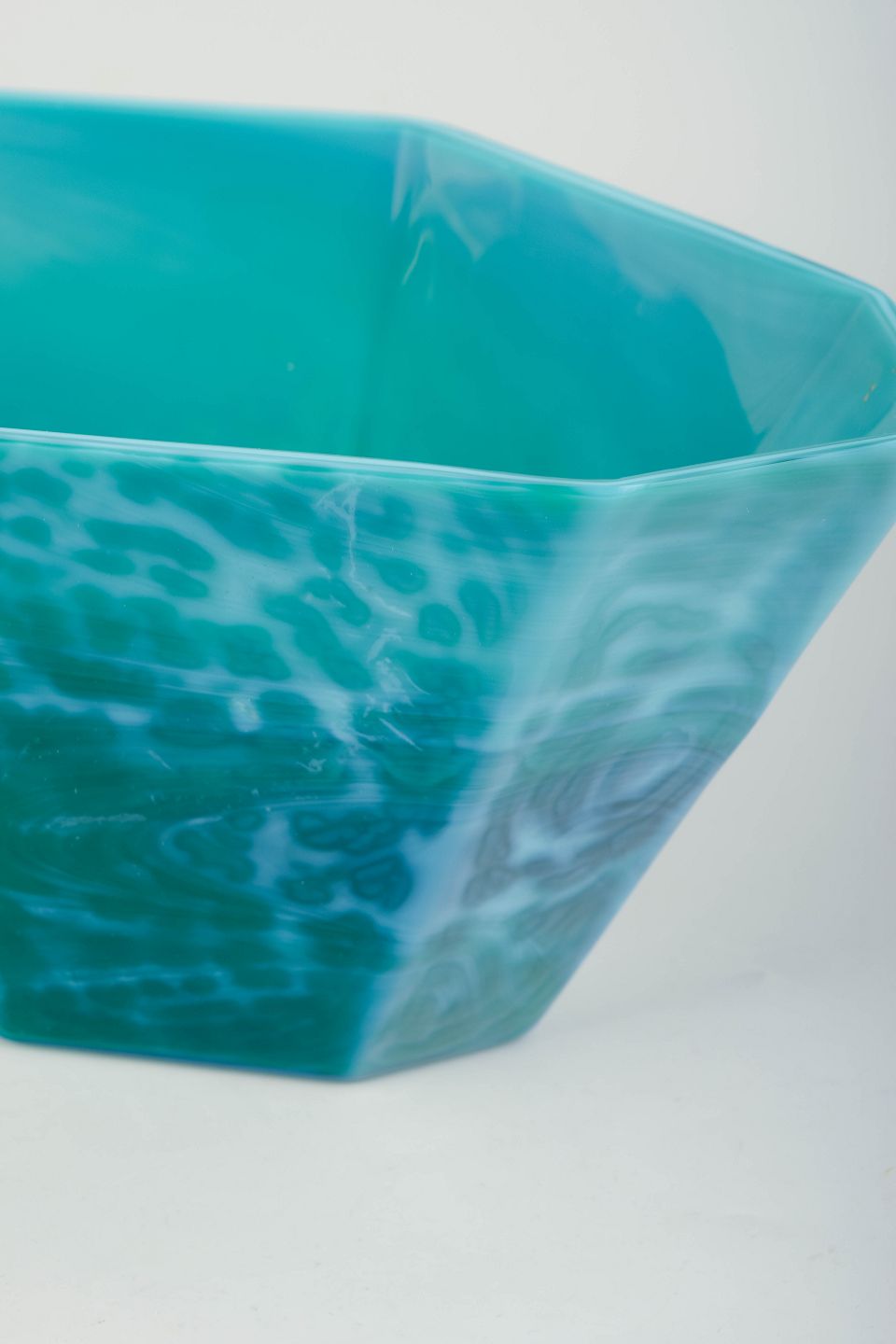Large octagonal bowl in thick art glass with vibrant turquoise tones and a marbled surface structure. Produced by Pukeberg Glasbruk and retaining the original sticker.