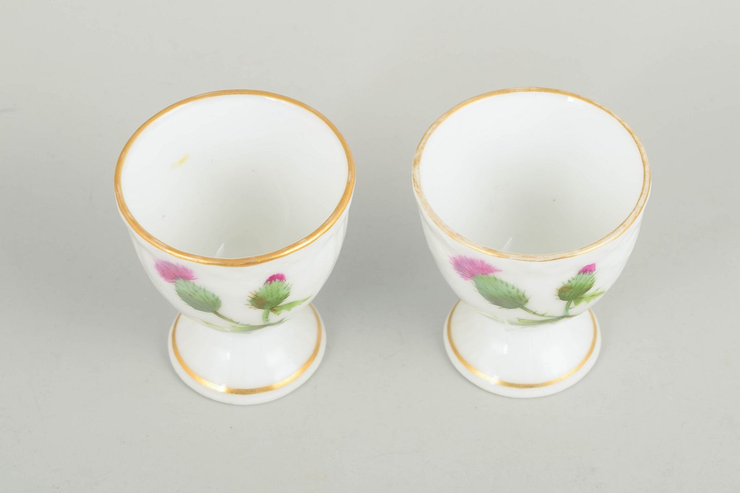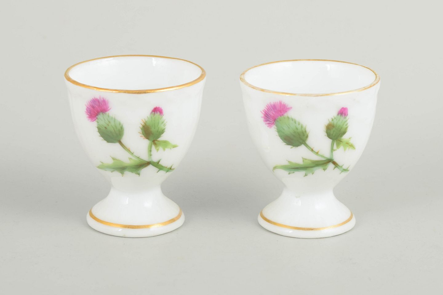 Two hand-painted porcelain egg cups from the Thistle series. Decorated with a thistle motif in green and pink tones with a gilt rim. First factory quality.
