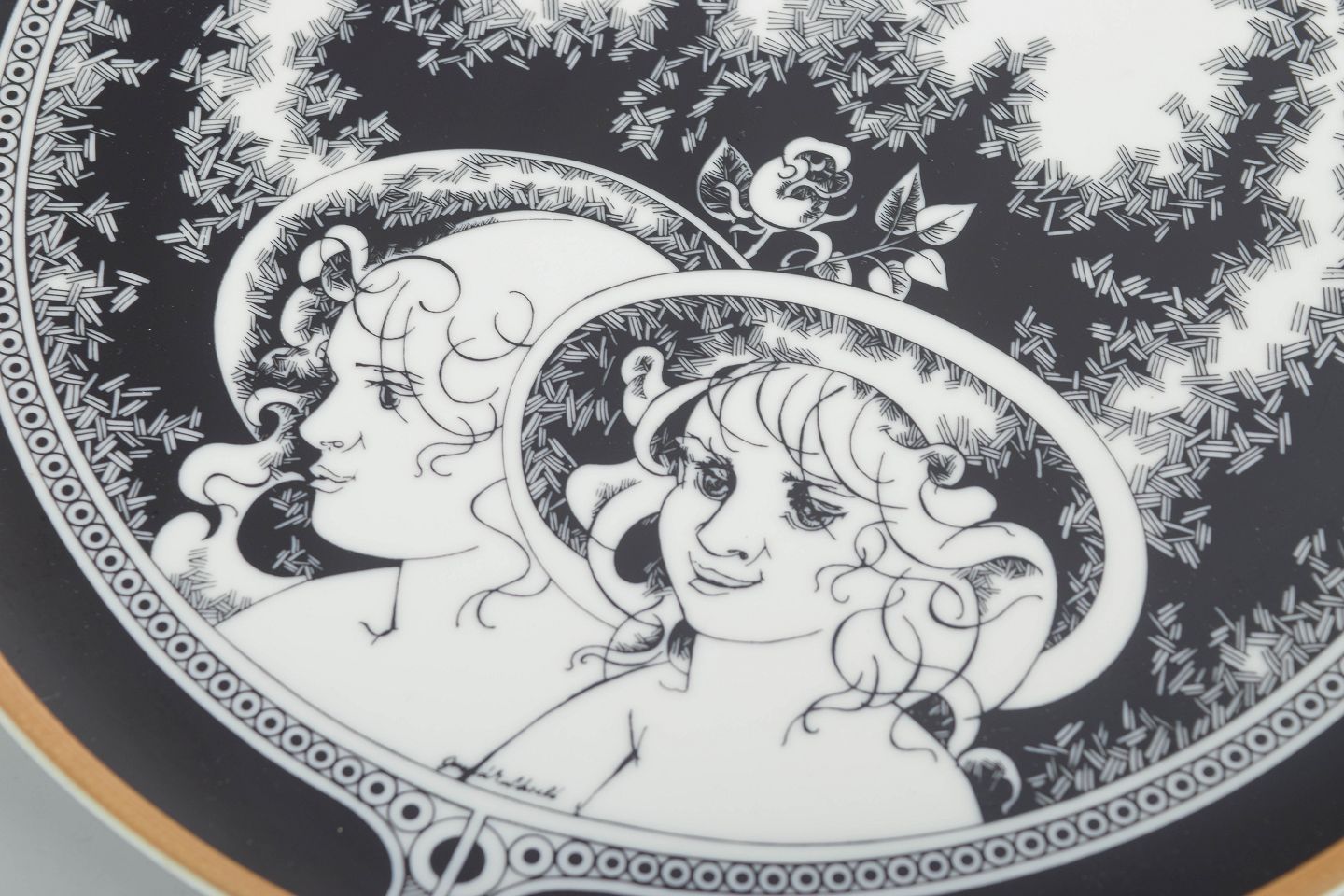 Large round dish in white glazed porcelain with black decorative border and figural motif on the lid. Produced by the Hollóháza Porcelain Manufactory.