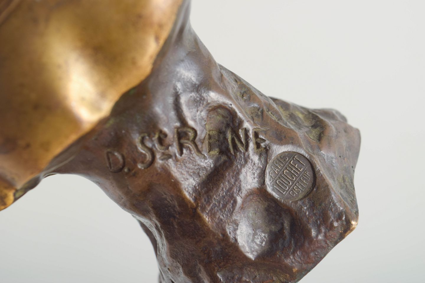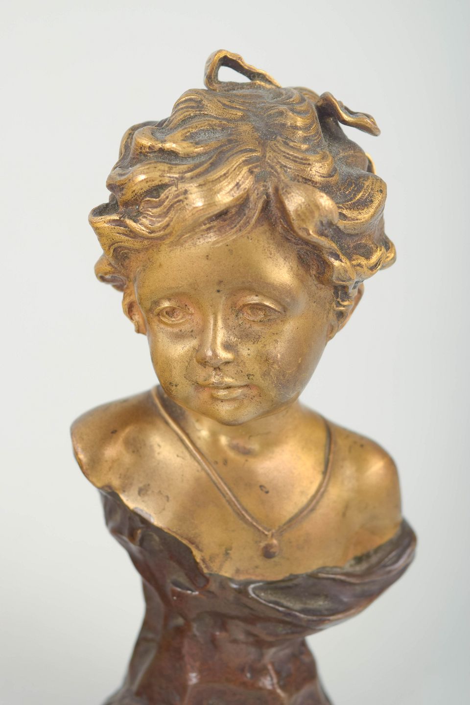 Figurative bust in solid bronze depicting a young girl with gently turned head and softly modelled facial features. Cast by Louchet, Paris, in the 1890s.