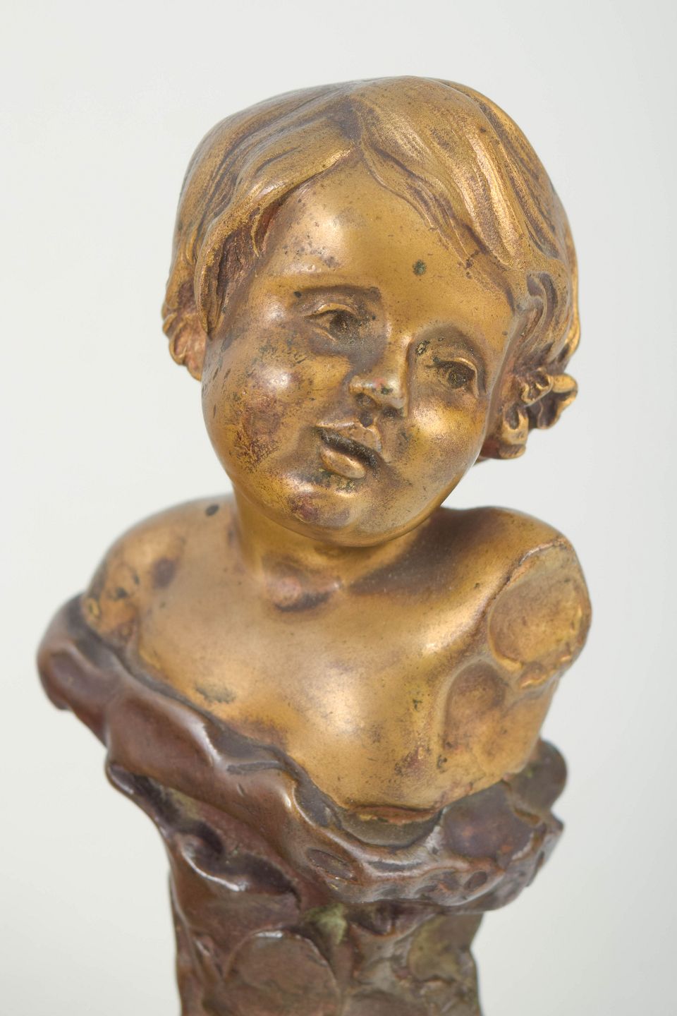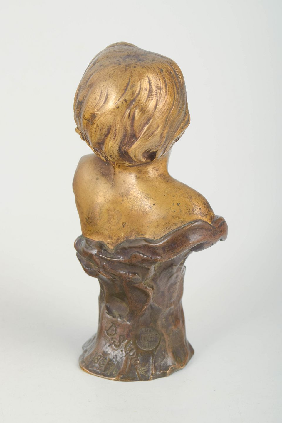 Figurative bust in solid bronze depicting a young boy with gently turned head and naturalistic modelling. Executed in 1897 and cast by Louchet, Paris.