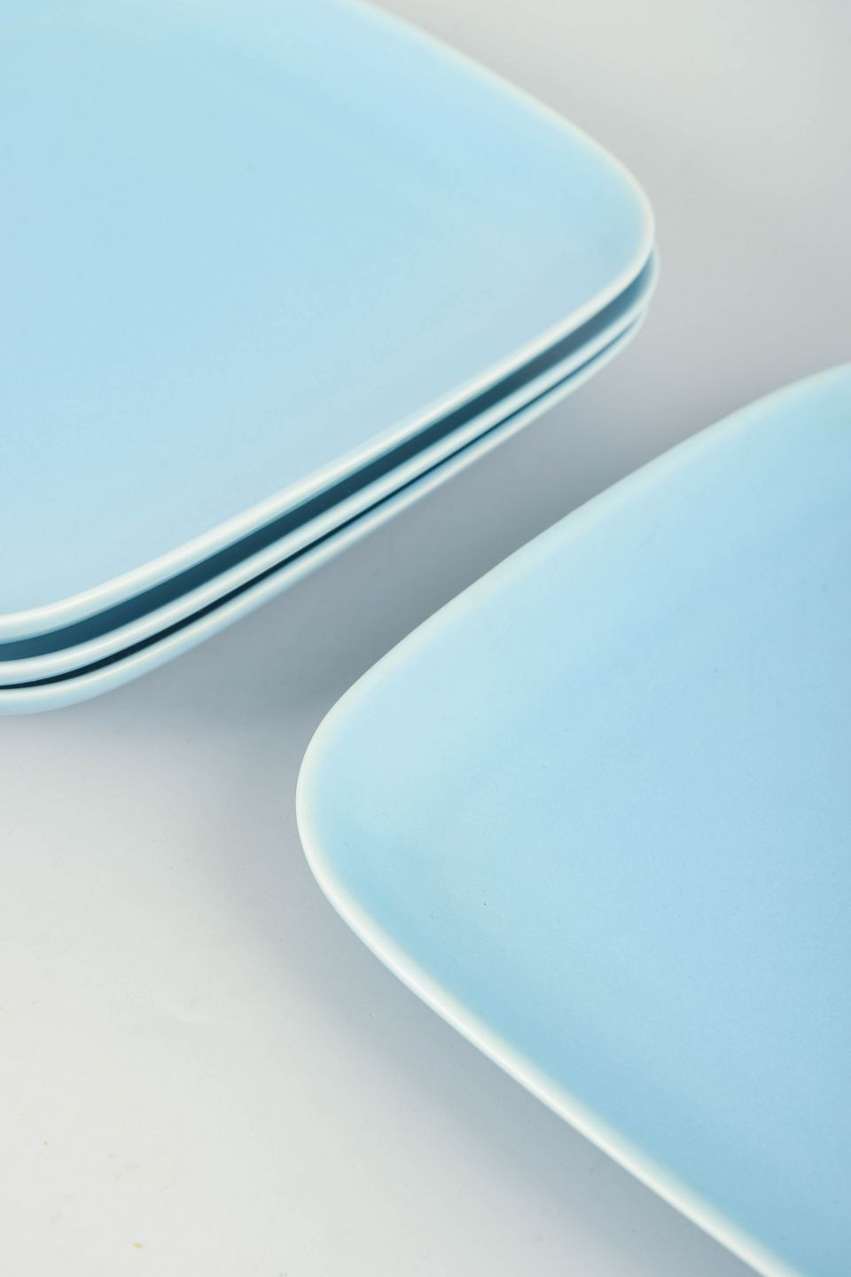 Square dinner plates in stoneware with rounded corners and an even turquoise glaze.