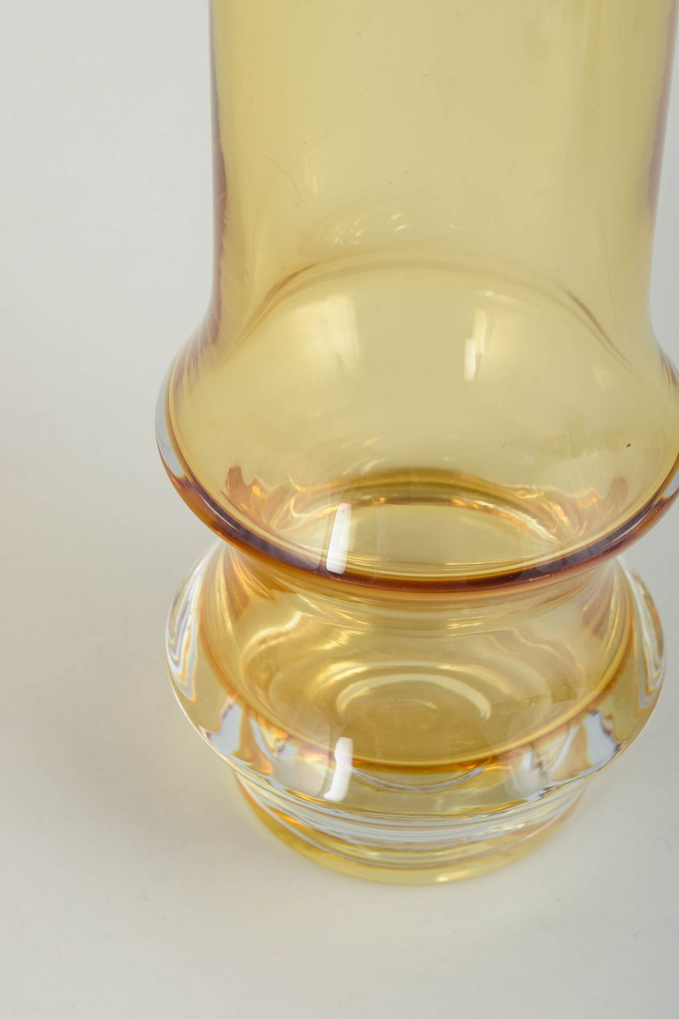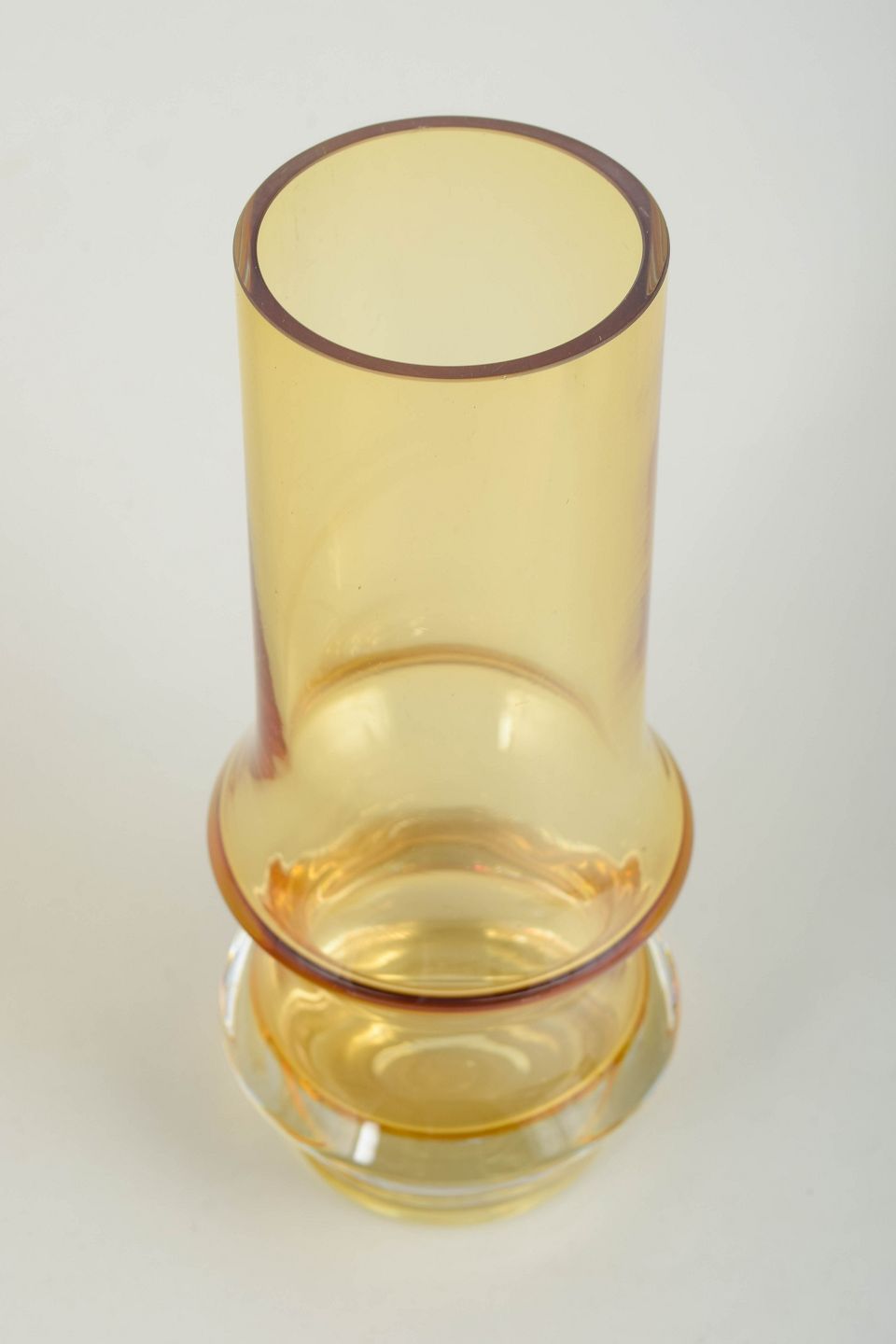 Tall cylindrical vase in amber art glass with slightly flared rim and a pronounced profiled base. Executed in mouth-blown glass with a warm golden tone and a solid clear foot. Unsigned.