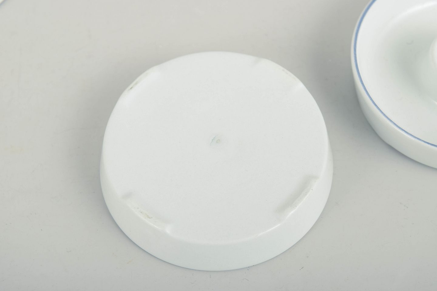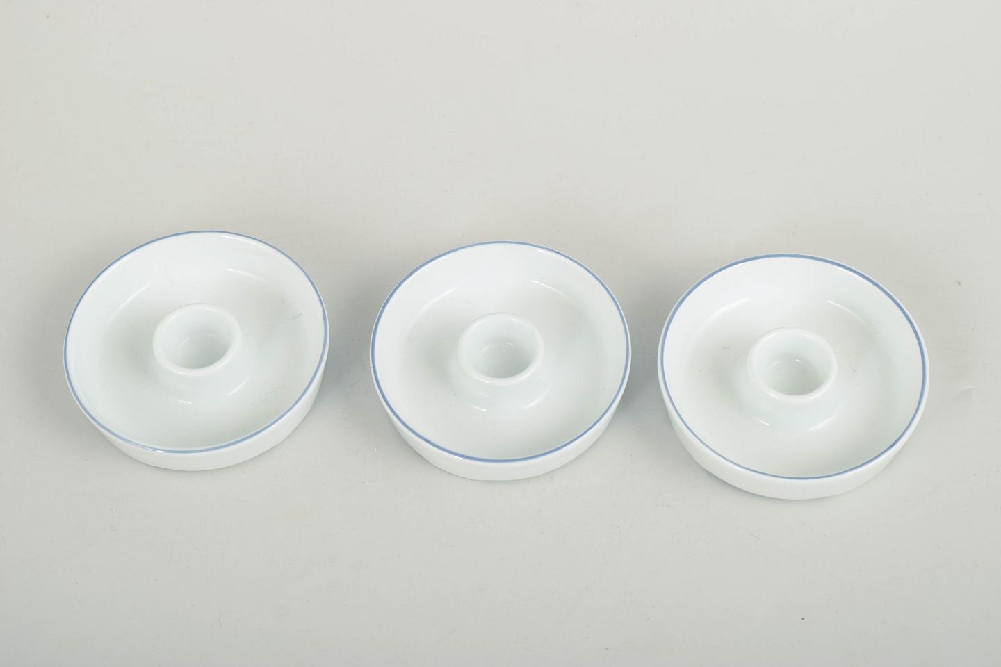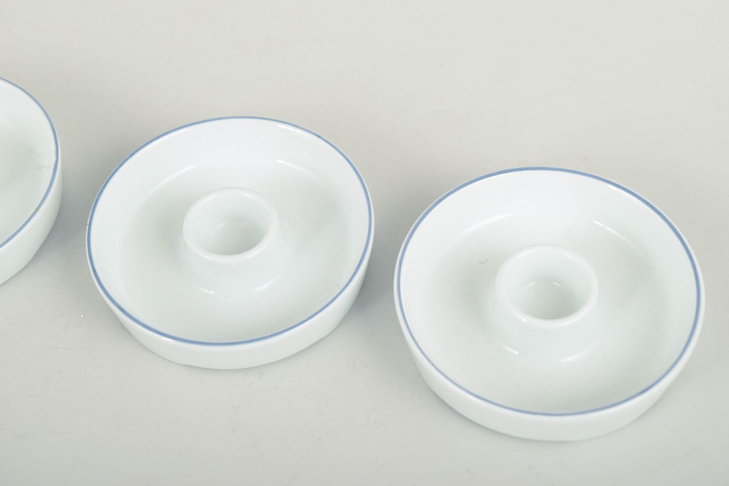 Three small round candlesticks in white glazed porcelain with a simple blue line along the rim. The design forms part of the Blue Line series and reflects the strict functionalist aesthetic of the 1970s. Unmarked.