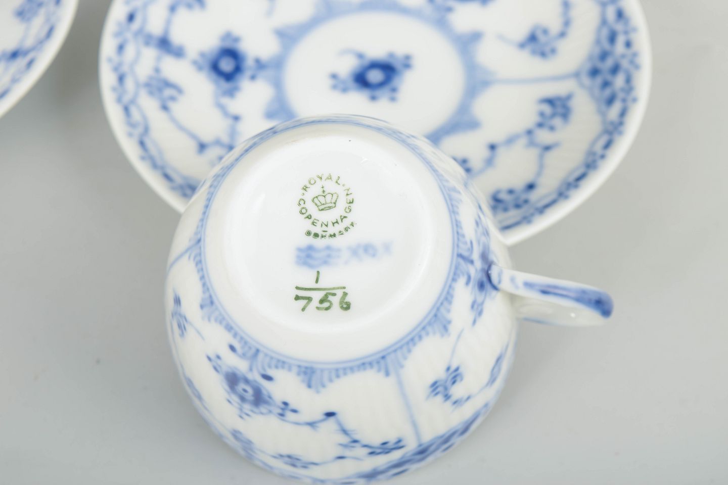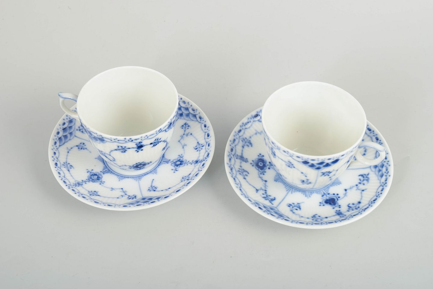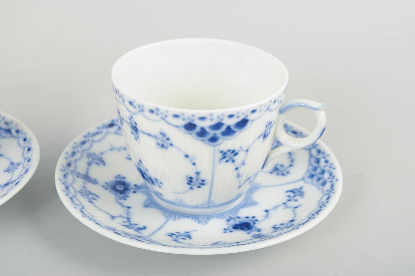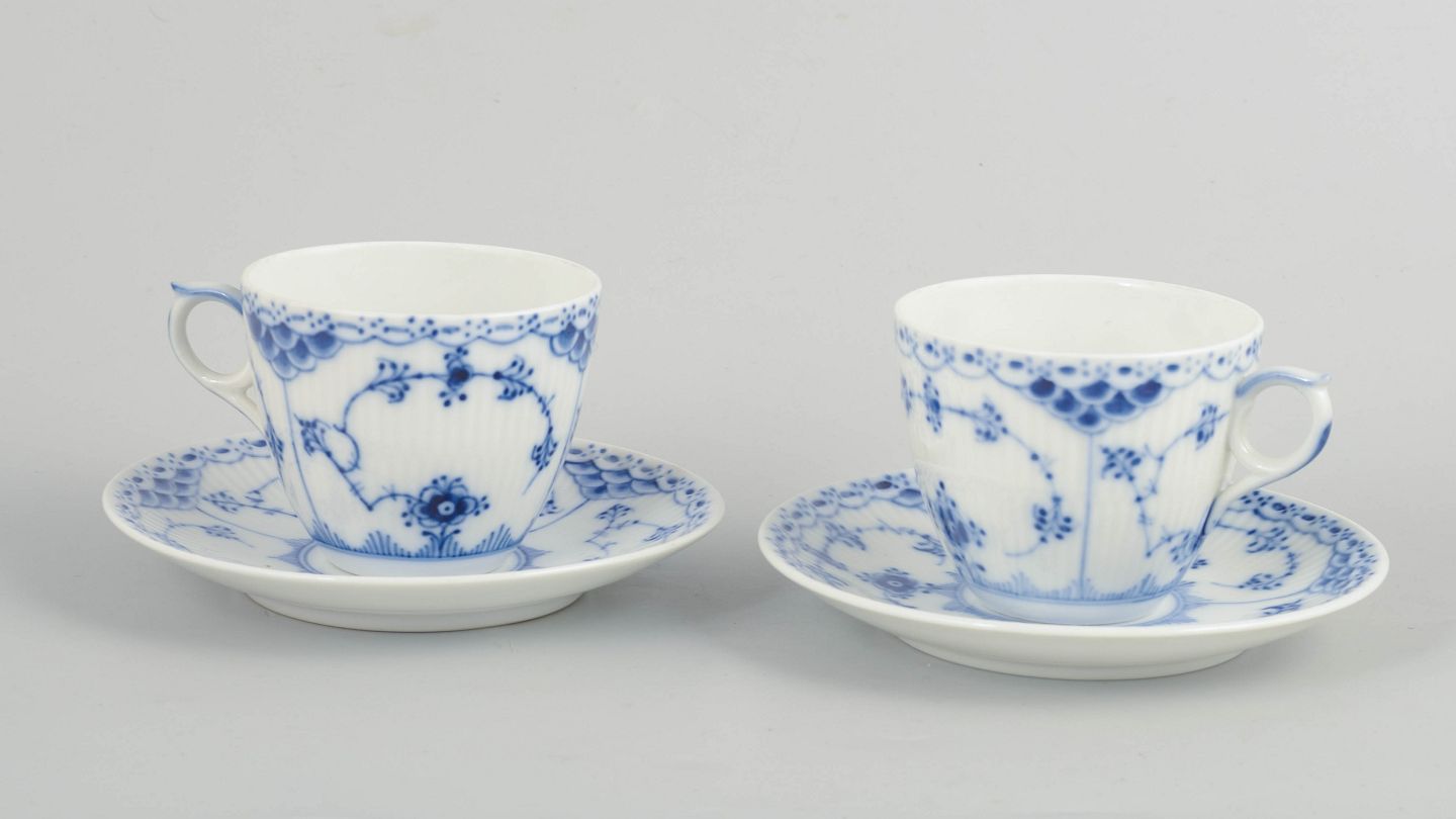 Royal Copenhagen Blue Fluted Half Lace, set of two coffee cups with matching saucers.