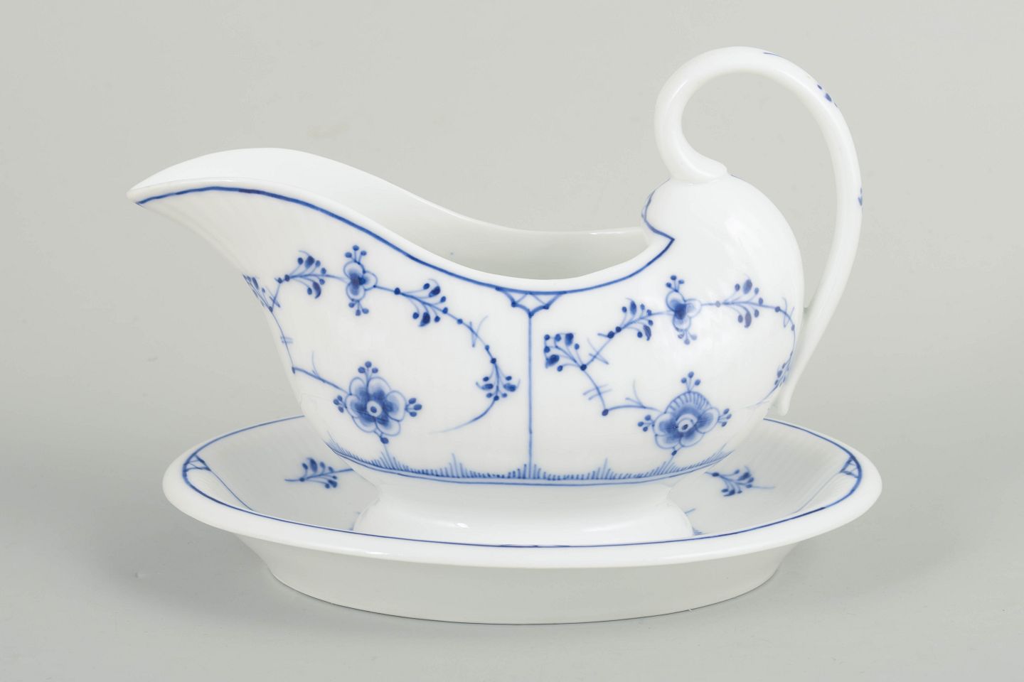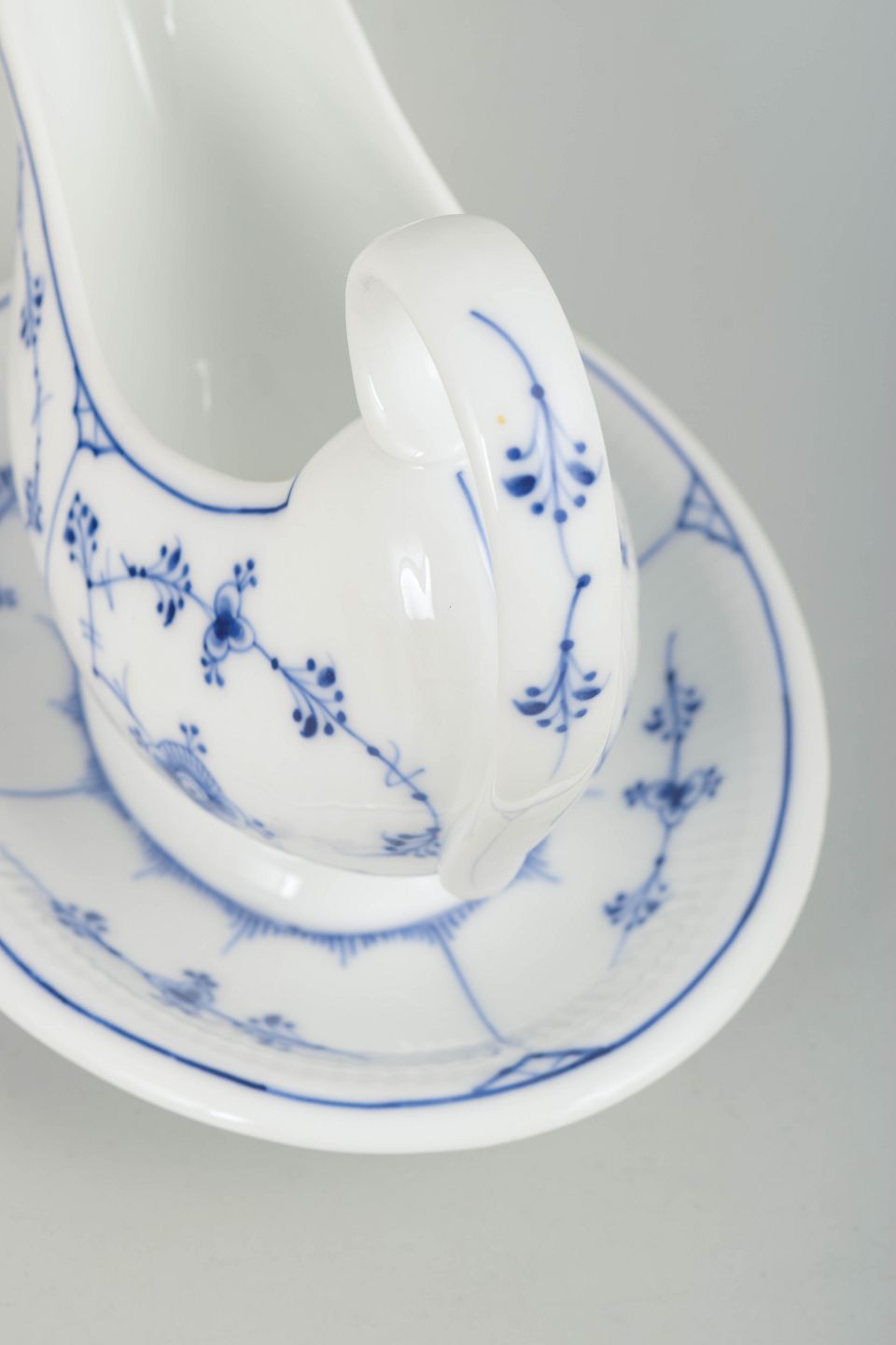 Rare antique sauce boat in hand-painted porcelain from the Blue Fluted Plain service with classic underglaze decoration in cobalt blue. Model 1/201. With fixed integrated stand made as one piece with the sauce boat. First factory quality. Produced in the 1890s.