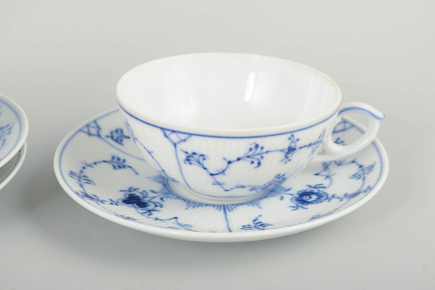 Set of three hand-painted porcelain tea cups from the Blue Fluted Plain service with classic underglaze decoration in cobalt blue. Model 1/76. Some pieces are first factory quality, others cancelled with one or two incised lines to the base.
