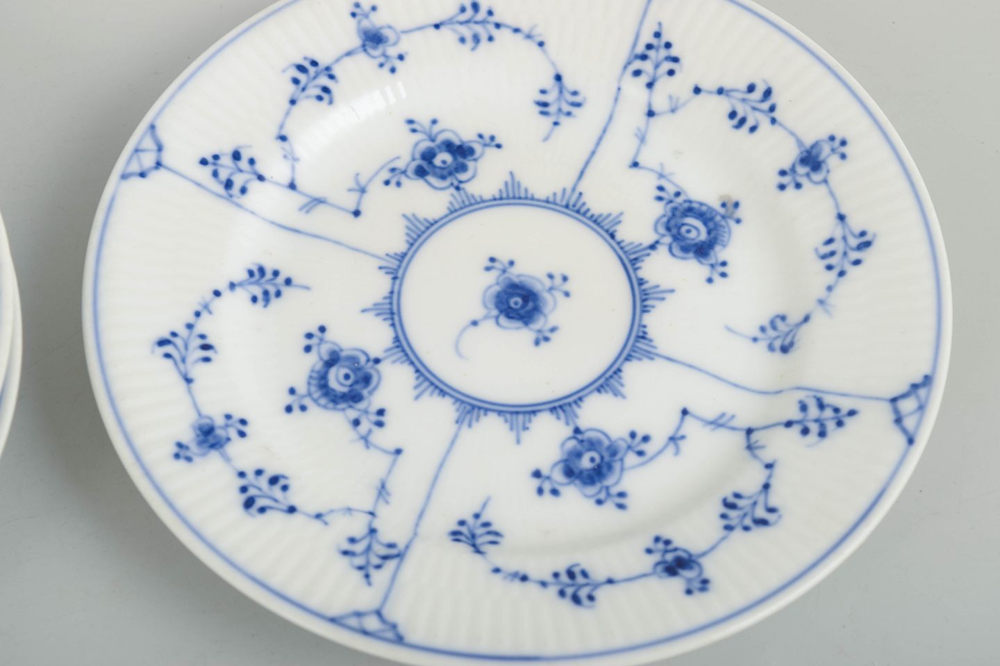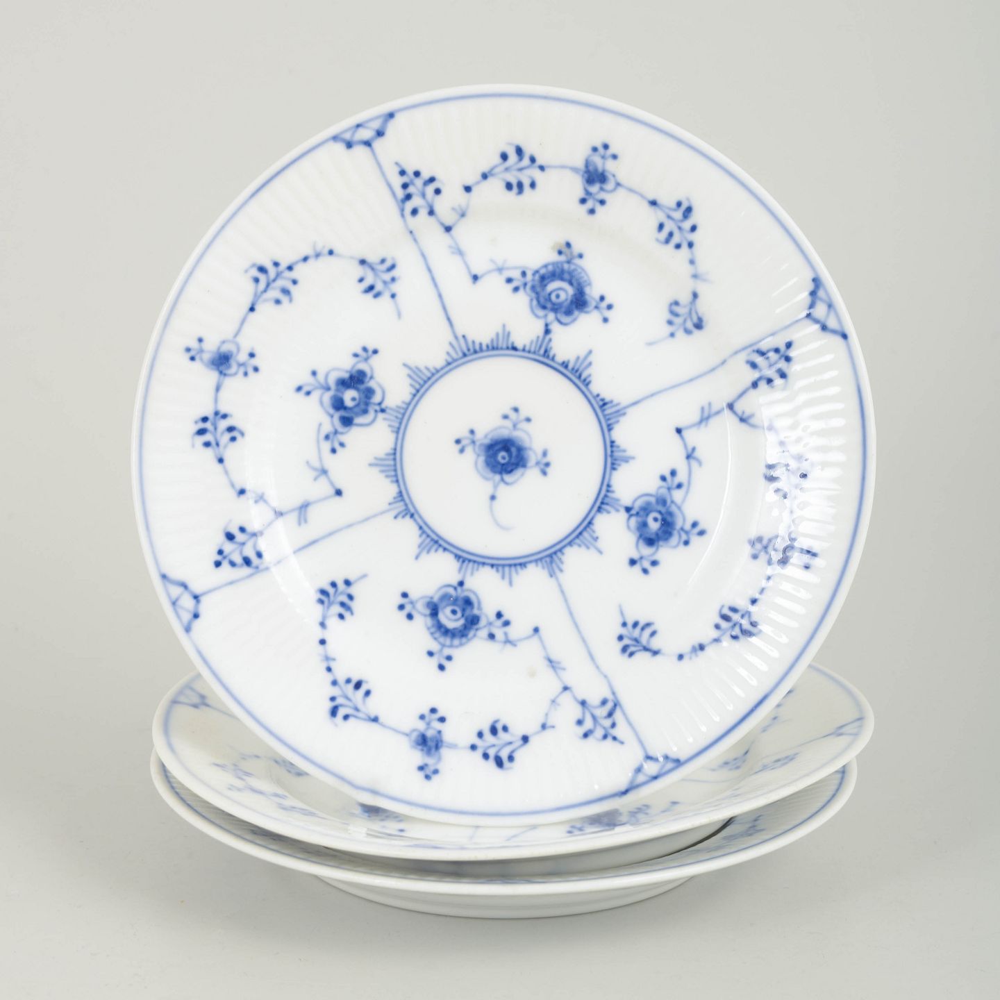 Set of three hand-painted porcelain cake plates from the Blue Fluted Plain service with classic underglaze decoration in cobalt blue. Model 1/181. Each plate measures 16 cm in diameter. Cancelled with one incised line to the base. Produced in 1950.