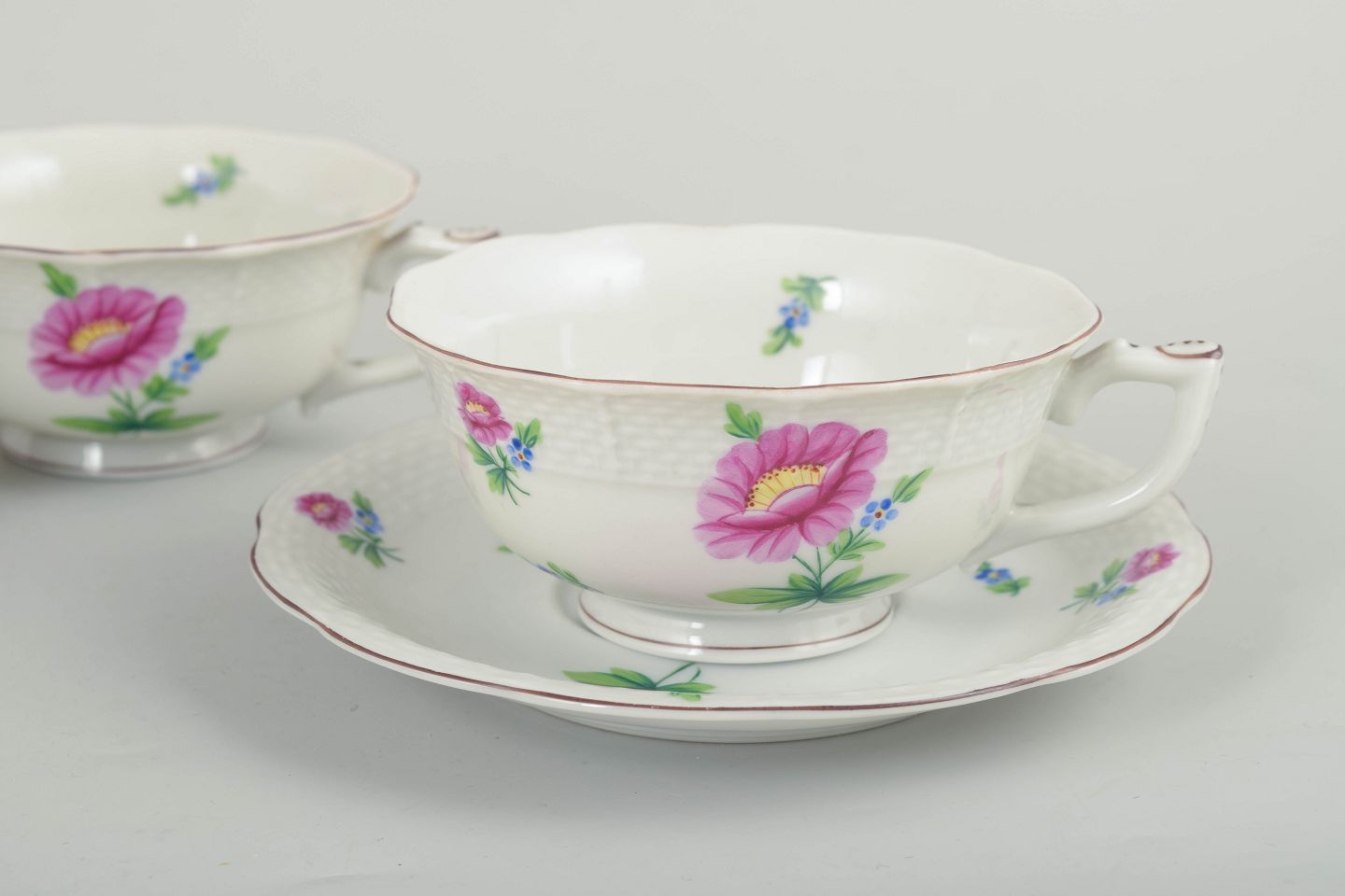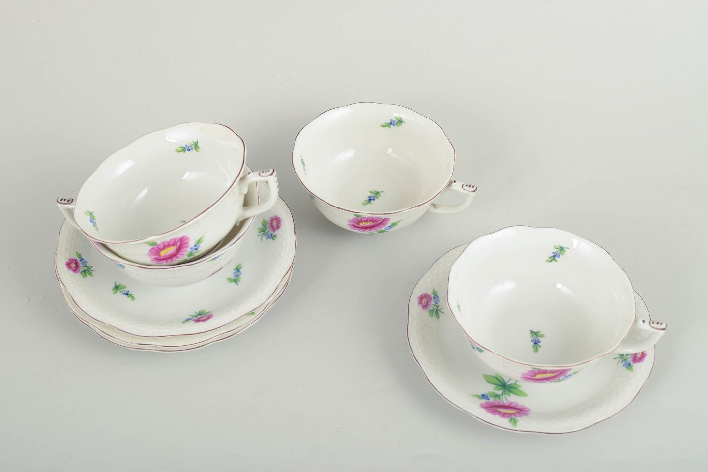 Set consisting of four hand-painted teacups with matching saucers in porcelain from Herend. Decorated with naturalistic flowers in pink and blue tones with delicate green leaves.