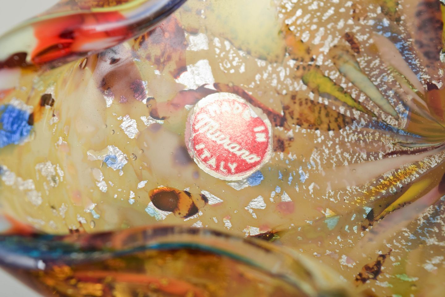 Organically shaped bowl in hand-blown glass with undulating rim. Executed in golden and amber tones in aventurine techniques, and multicoloured elements. Original sticker preserved. Produced on Murano in the 1960s/70s.