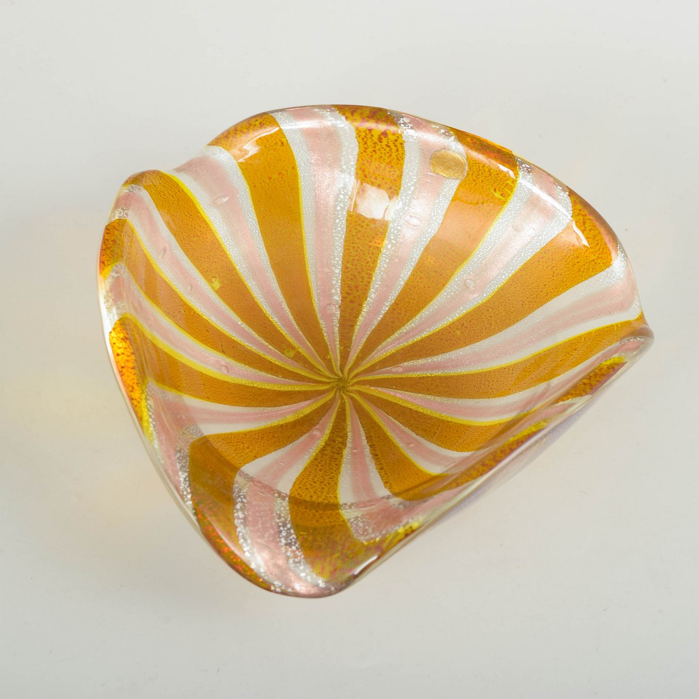 Organically shaped bowl in hand-blown glass with twisted rim. Executed in warm yellow and white stripes, aventurine technique, and iridescent effect. Original sticker preserved. Produced on Murano in the 1960s/70s.
