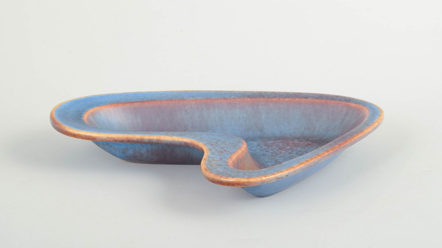 Organically shaped stoneware bowl with an asymmetrical, free-form silhouette. Decorated with a blue and violet glaze with a warm-toned rim, characteristic of Gunnar Nylund’s experimental glazes at Rörstrand in the mid-20th century. First factory quality.