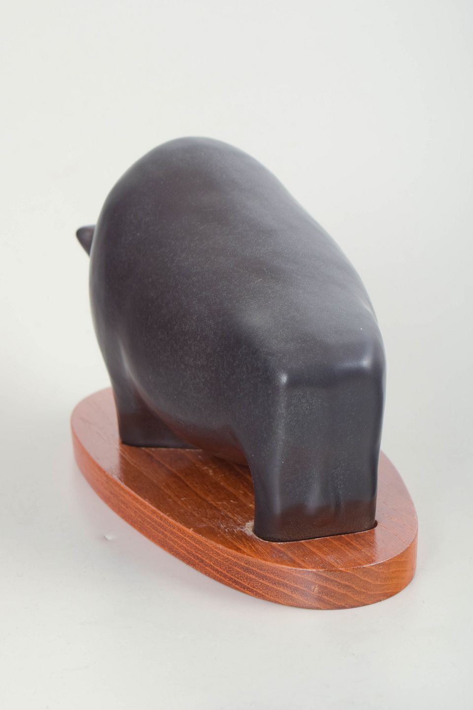 Powerfully modelled bull in dark, matte-glazed stoneware with a compact, stylised form and strong volume. The figure is mounted on an oval wooden base and displays a restrained modernist design characteristic of Rörstrand’s mid-twentieth-century production. First factory quality.