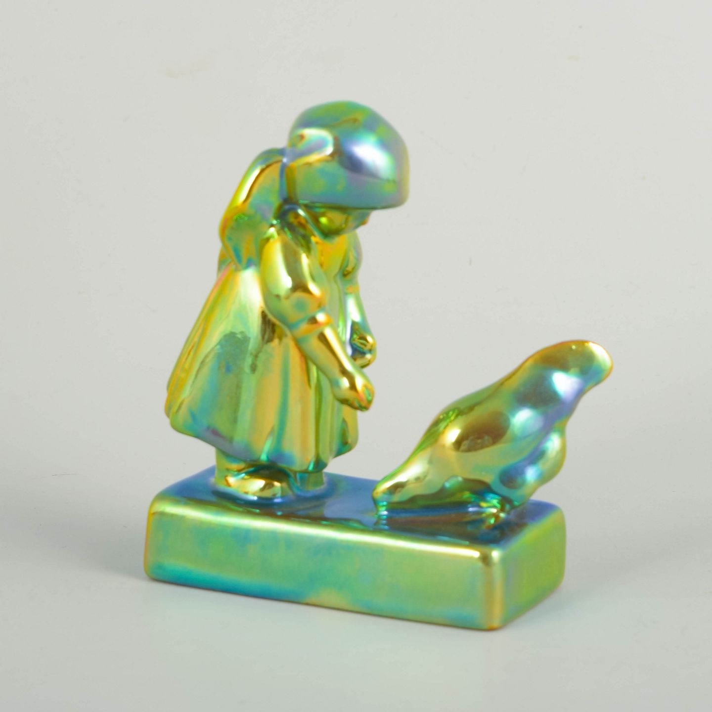 Decorative figural group in faience with iridescent eosin glaze in green and golden tones. The motif depicts a girl standing before a chicken on a rectangular base, designed in a stylised Art Deco manner.