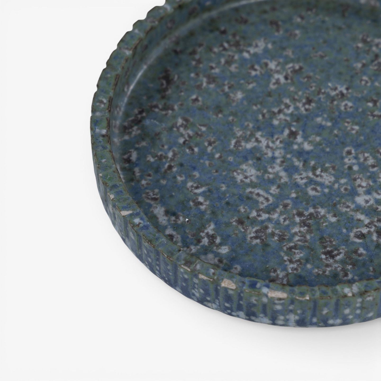Round dish in fluted stoneware with blue-green glaze. Signed.