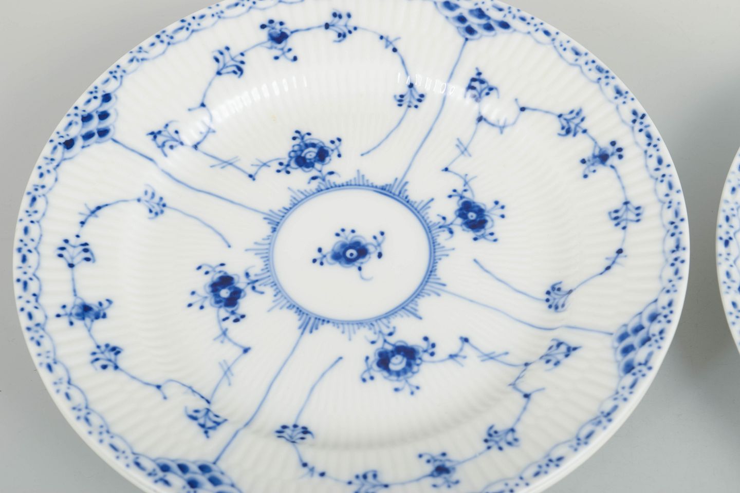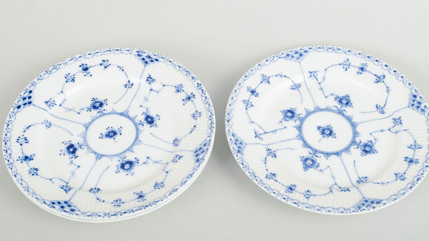 Royal Copenhagen was founded in 1775 in Copenhagen under royal charter. The factory is internationally recognised for its hand-painted porcelain and high artistic standards. Blue Fluted Half Lace is a variation of the classic Blue Fluted service, combining fluted surfaces with a decorative lace border executed with exceptional craftsmanship.