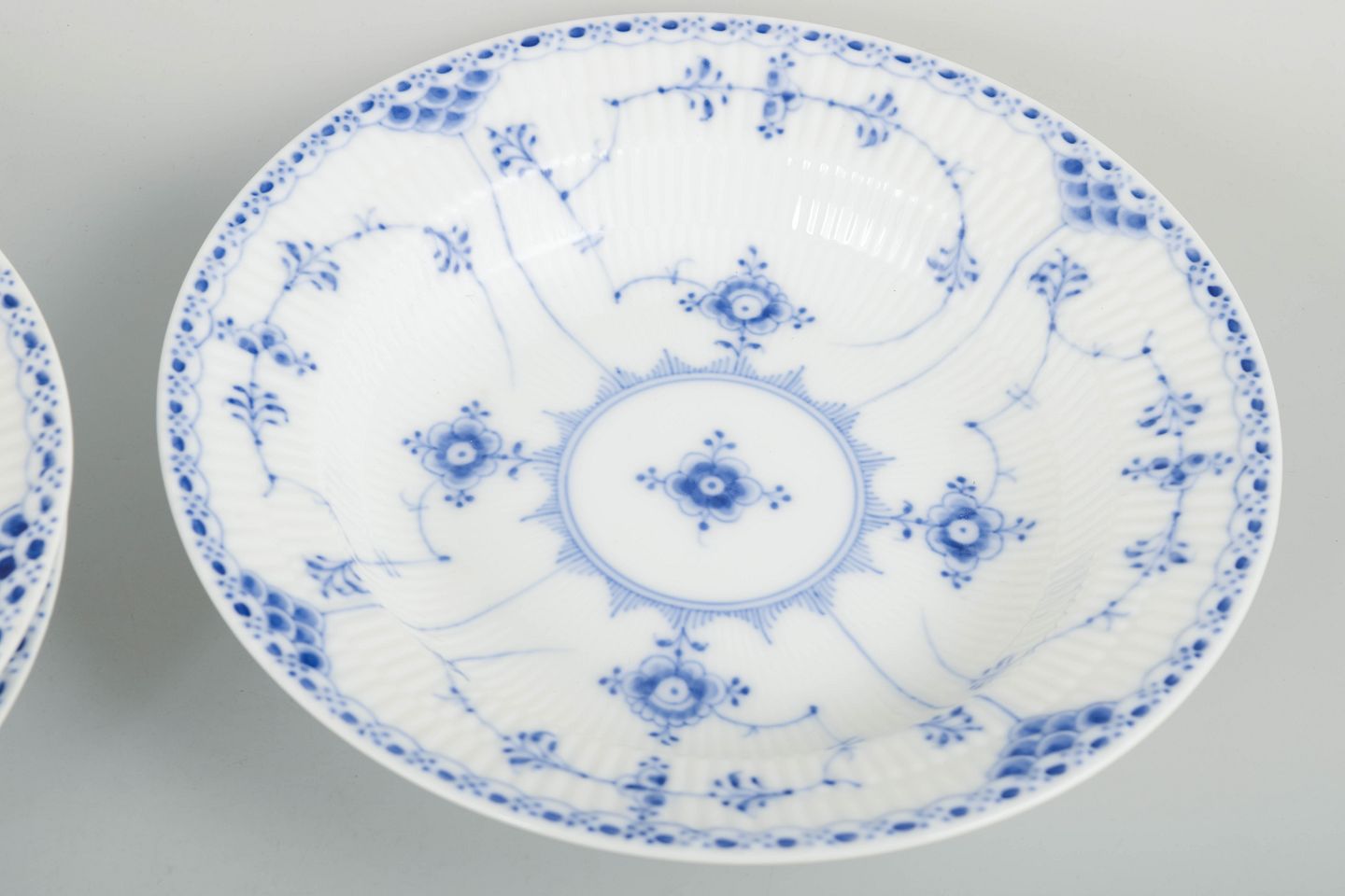 Royal Copenhagen was founded in 1775 in Copenhagen under royal charter. The factory is internationally recognised for its hand-painted porcelain and high artistic standards. Blue Fluted Half Lace is a variation of the classic Blue Fluted service, combining fluted surfaces with a decorative lace border executed with exceptional craftsmanship.