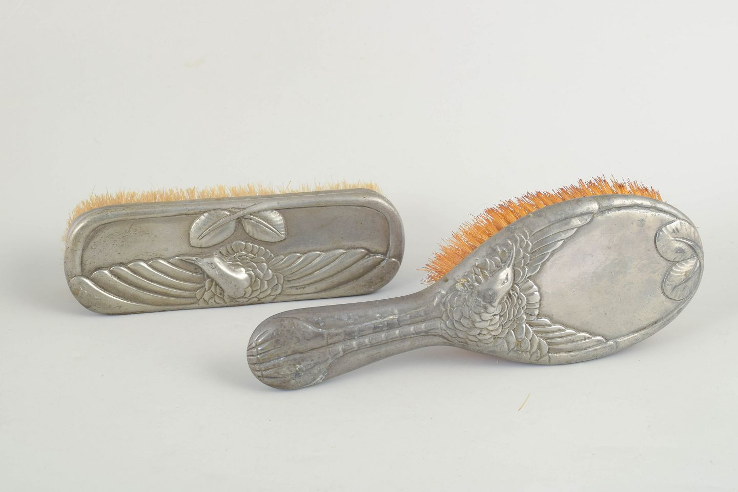 Brush set in pewter made in Art Nouveau style with relief decoration of herons and stylised natural motifs. The set consists of two brushes with decorative handles. Model Hejre.