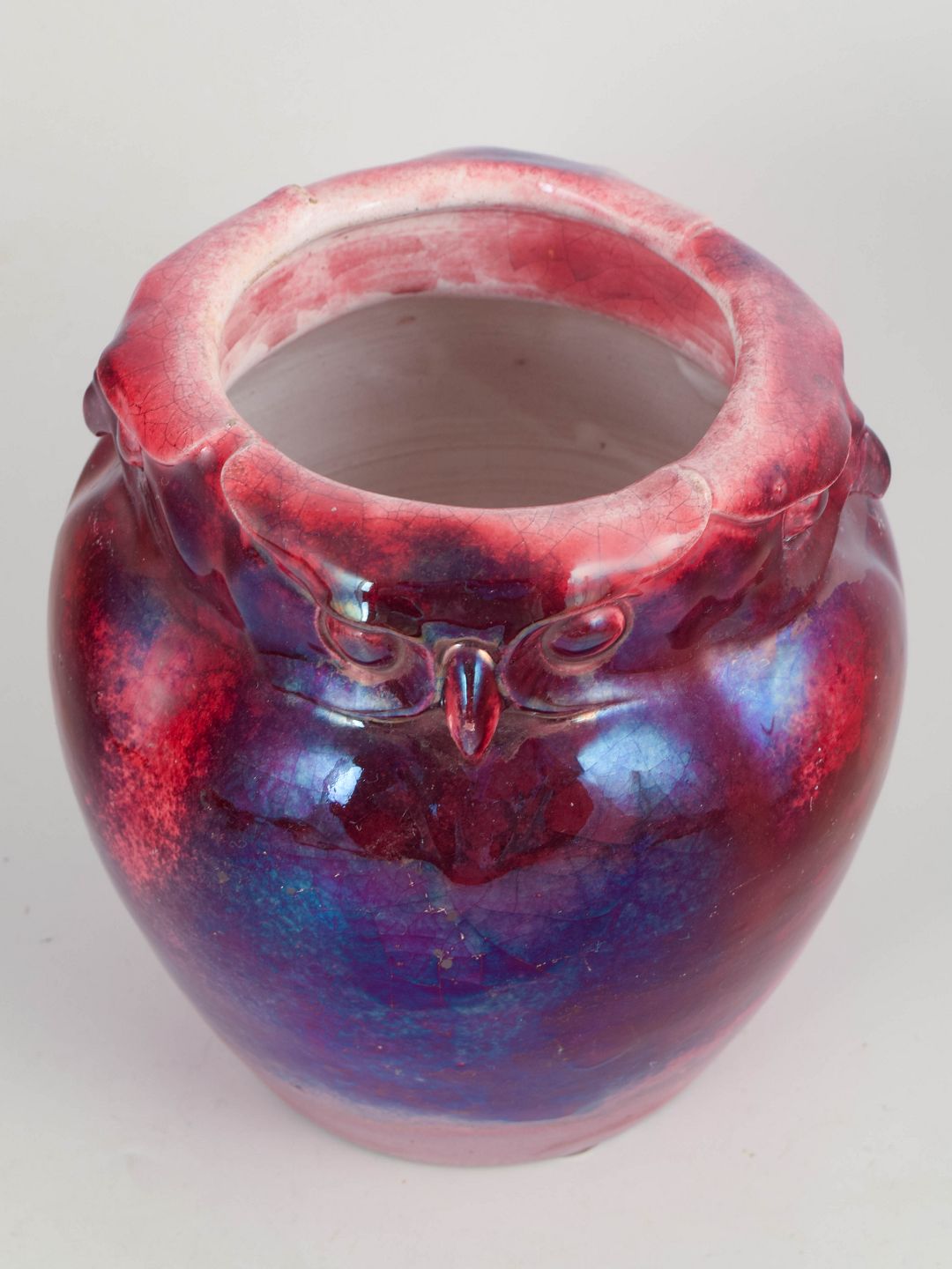Unique art pottery owl vase with sculptural owl decoration along the rim and iridescent glaze in red and blue tones. Produced at Kähler in the 1890s during Karl Hansen Reistrup’s tenure as artistic director from 1888.