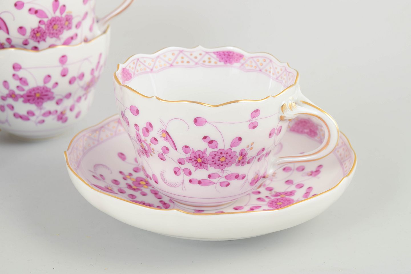 Meissen, "Pink Indian" set of five large coffee cups with matching saucers.