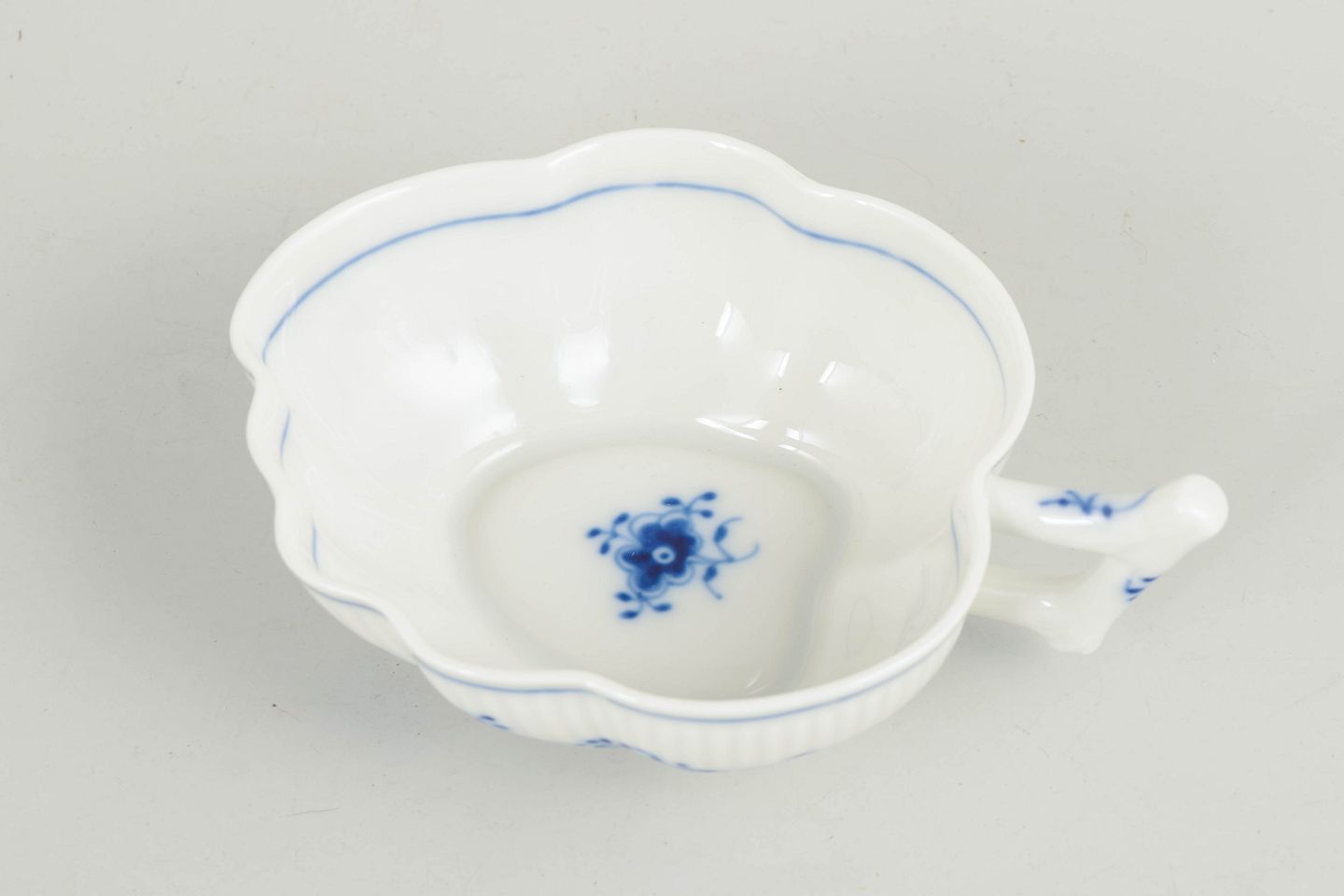 Small Leaf Dish w handle in hand-painted porcelain from Blue Fluted Plain with classic underglaze decoration in cobalt blue and fluted sides. Model 101/150. First factory quality. Produced 1985–1991.