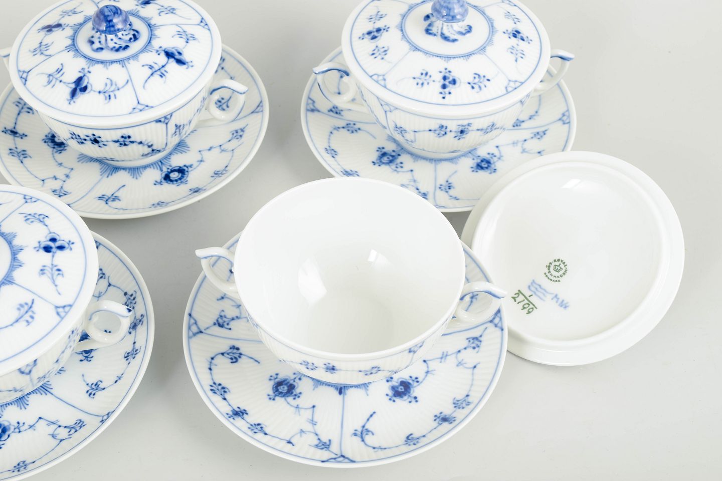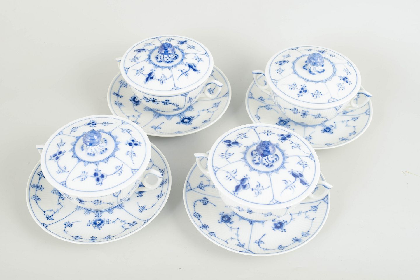 Set of four bouillon cups with matching saucers in hand-painted porcelain from Blue Fluted Plain with classic underglaze decoration in cobalt blue. Model 1/2199. Some pieces are first factory quality, others are cancelled with one incised line on the base.