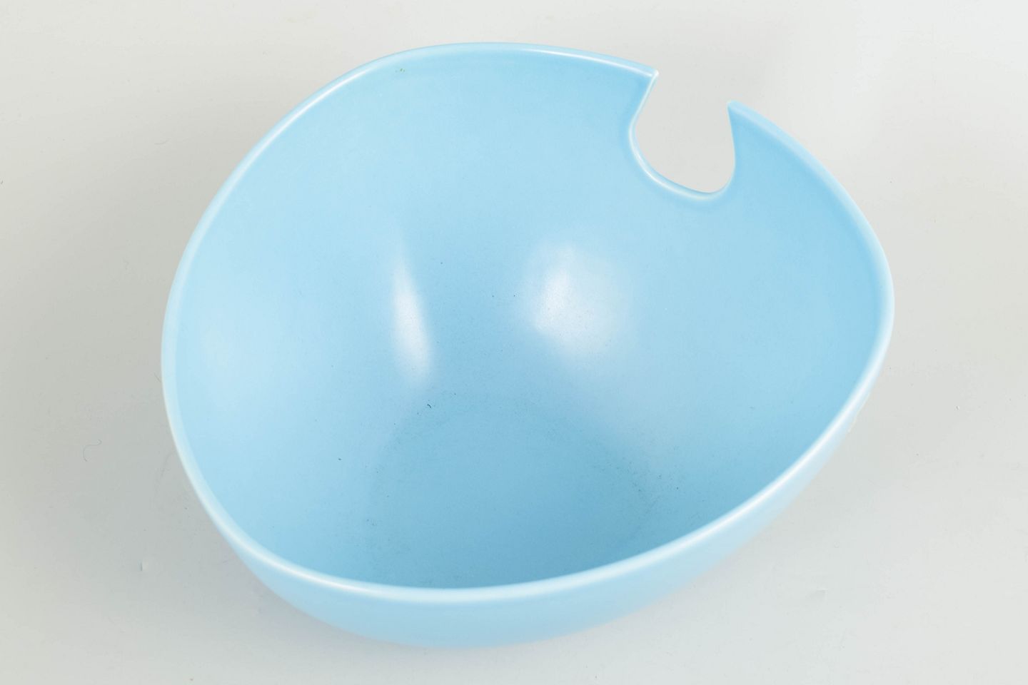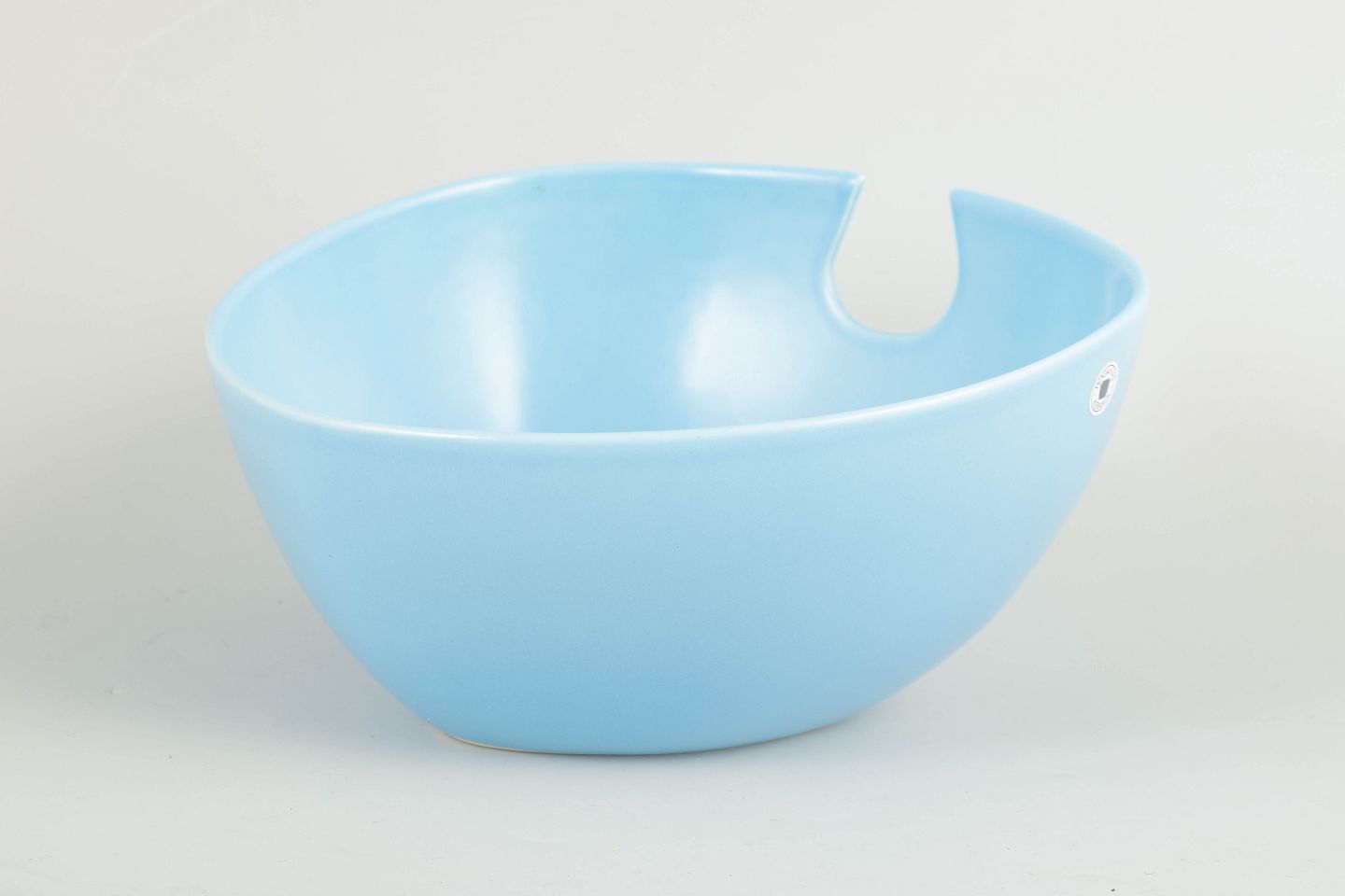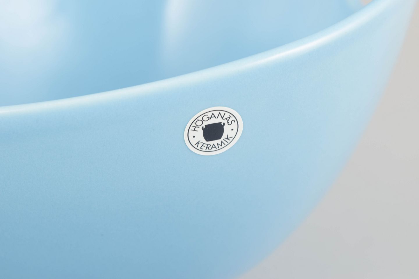 Large stoneware salad bowl with light blue glaze and characteristic pouring notch on the rim. Marked Höganäs Keramik Made in Sweden.