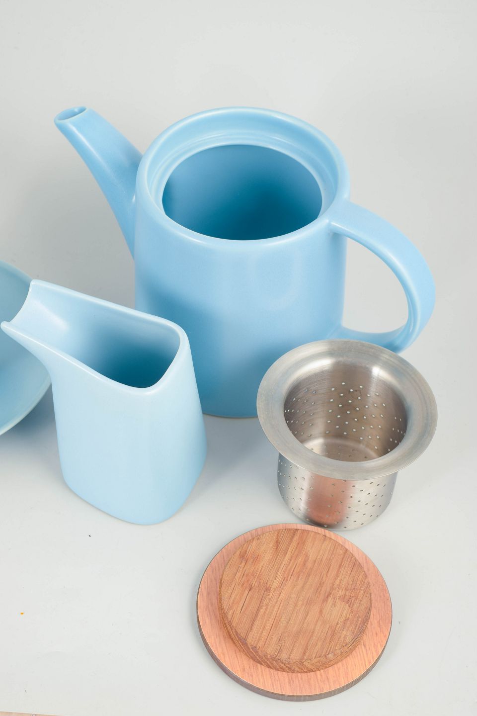 Stoneware tea set consisting of three mugs, teapot, creamer and saucers. Made in a light blue glaze with simple modern forms. Marked Höganäs Keramik Made in Sweden model 3.