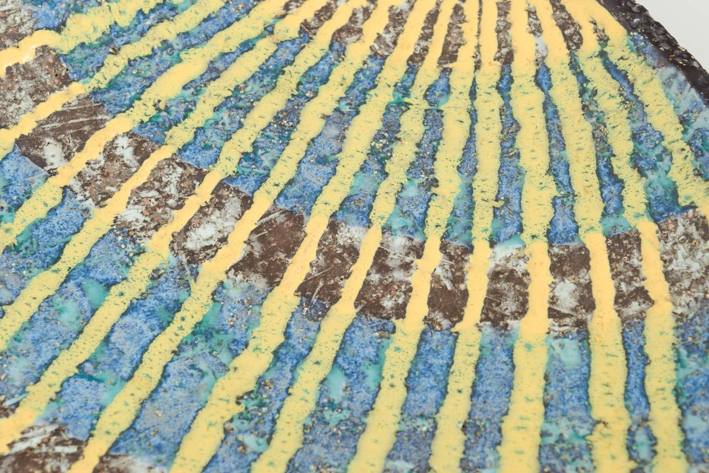 Large oval ceramic dish model 2350 in stoneware with relief decoration and multicoloured glaze in blue and yellow tones.