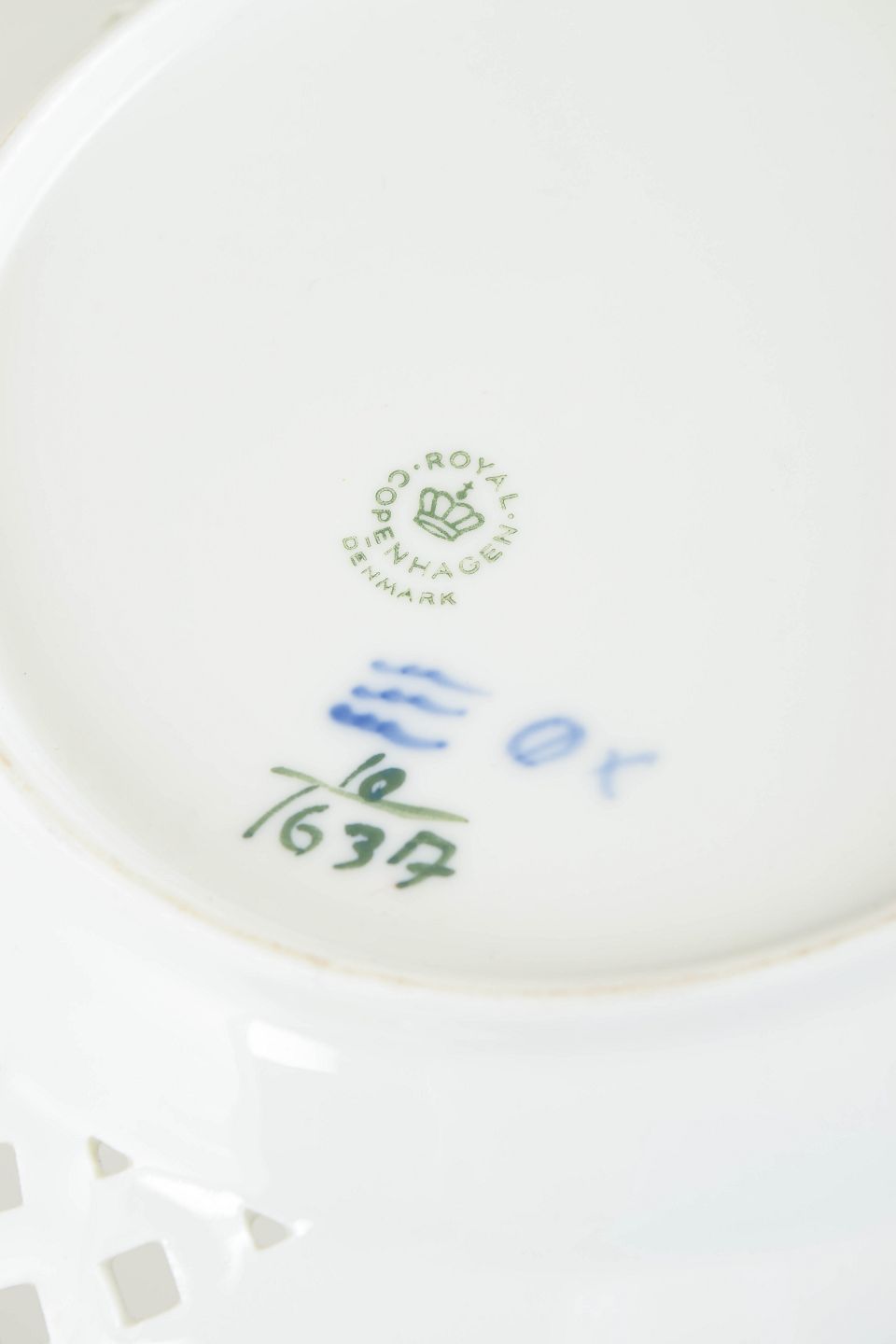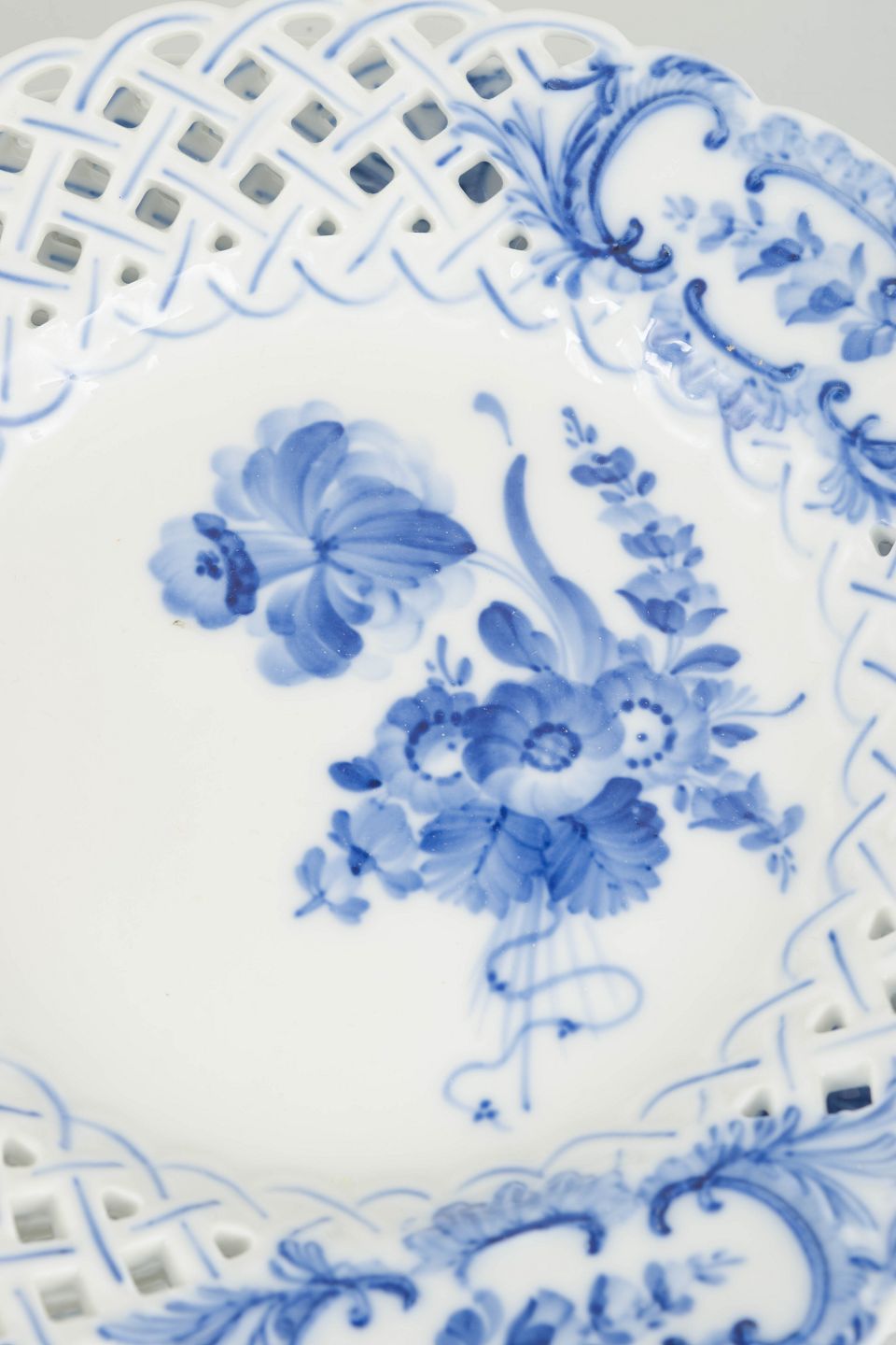 Royal Copenhagen was founded in 1775 in Copenhagen under royal patronage. The factory is internationally recognised for its hand-painted porcelain and high artistic standards. Blue Flower was introduced in the eighteenth century and continued into the twentieth century, characterised by its naturalistic floral decoration and distinctive pierced rim.