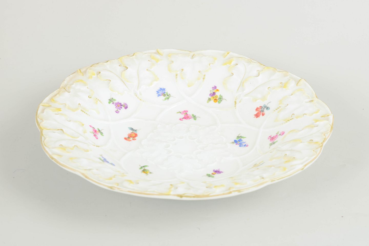 Large circular porcelain dish with relief decoration and hand-painted flowers in polychrome colours and a gilded rim. Marked with Meissen crossed swords and first factory quality.