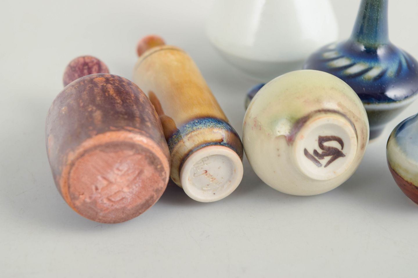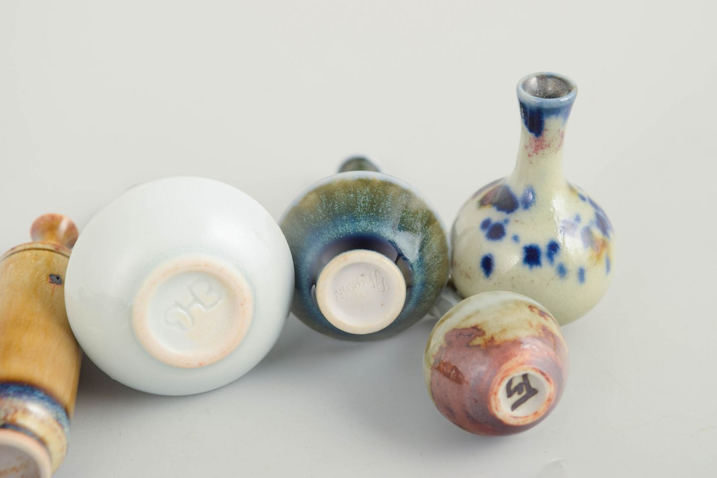 Collection of six miniature ceramic vases in varied forms and glazes. Made in ceramic with multicoloured glazes in blue, brown and light tones. All examples are marked on the base. Examples are from Höganäs and others from various makers.