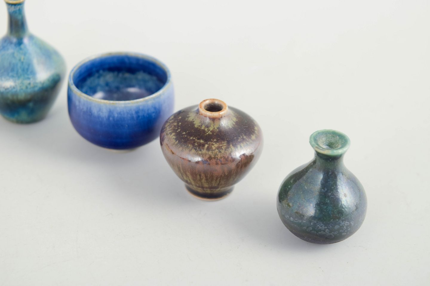 Collection of six miniature ceramic pieces consisting of small bowls and vases in varied forms and glazes. Made in ceramic with multicoloured glazes in blue, brown and yellow tones. Three examples are from Höganäs and others from various makers. Typical decorative miniature ceramics from the 1960s.