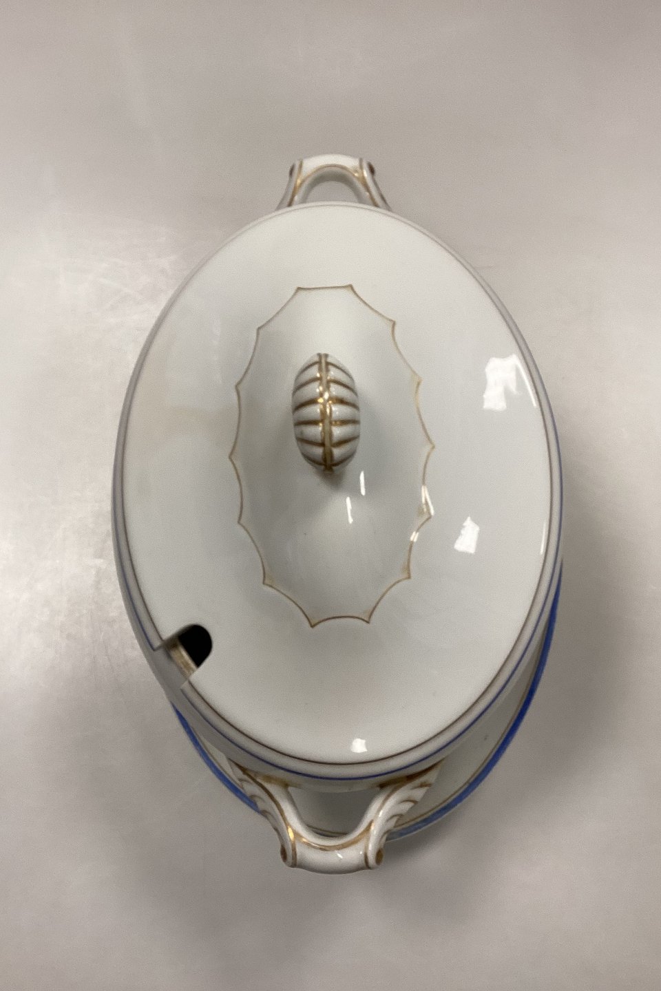 Royal Copenhagen Tureen with saucer No. 282/9056 and 9057. White porcelain with decoration in gold and cobalt blue.Light wear on gold and edges.