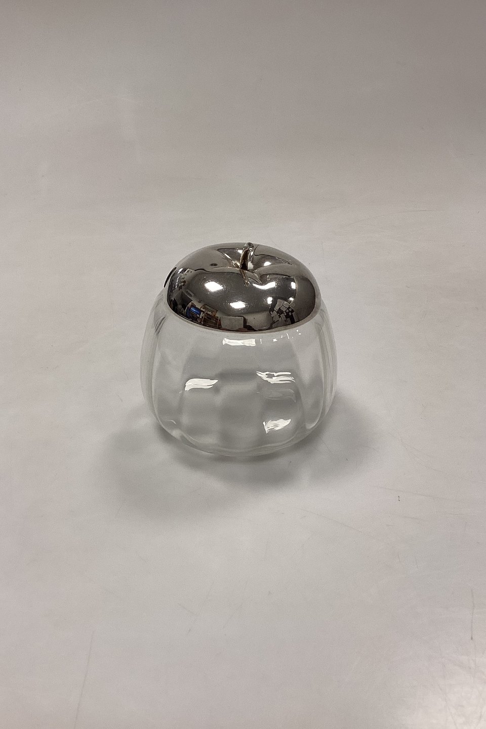 English Silver Plate/EPNS Jam Jar. The glass has optical grooves and the lid is shaped like the top of an apple.