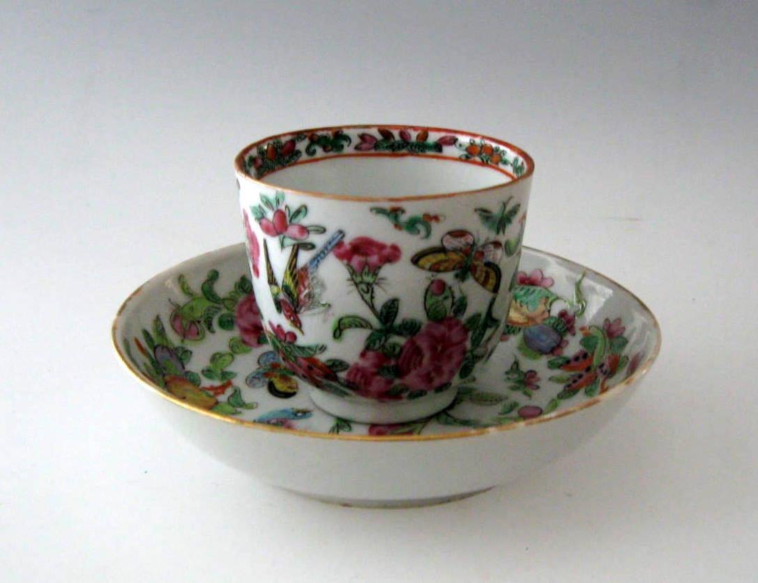 Famille rose cup, China, 19th century. With saucer. Polycrom decoration with roses, birds and insects. Height: 6,5 cm. Dia. saucer: 13 cm.