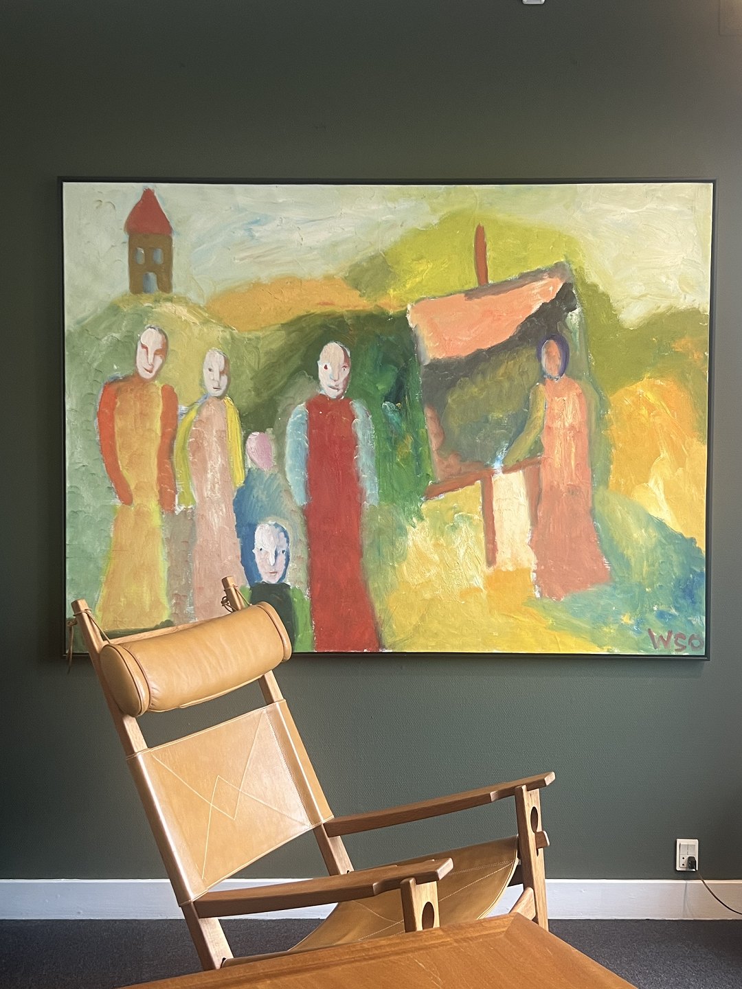 William Skotte Olsen, 1945-2005, oil on canvas. Landscape with people. Signed WSO. Visible size: 134x184cm. With frame: 138x188cm |