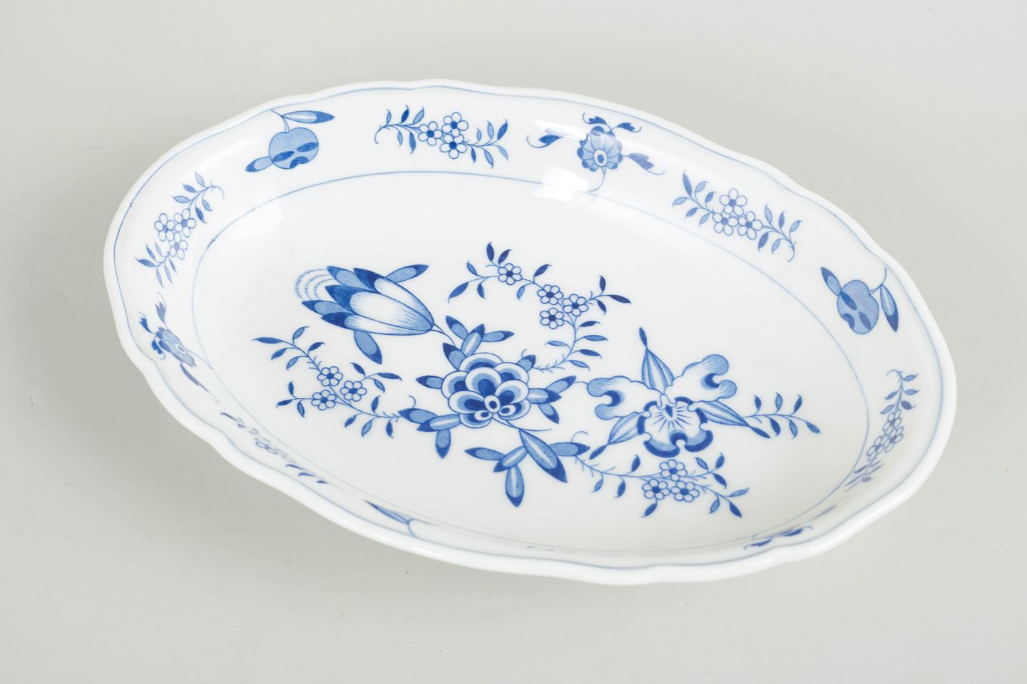 Oval bowl in hand-painted porcelain with Blue Orchid decoration. Produced by Meissen and marked with the Meissen crossed swords. Cancelled with two incised lines on the underside.