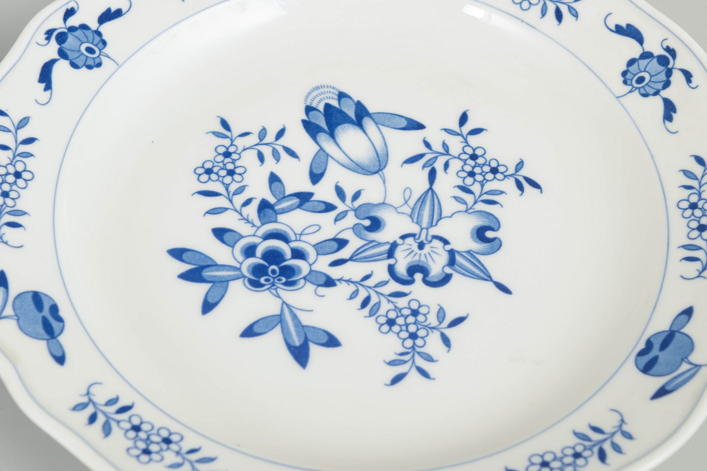 Two hand-painted porcelain lunch plates with Blue Orchid decoration. Produced by Meissen and marked with the Meissen crossed swords. Cancelled with two incised lines on the underside.