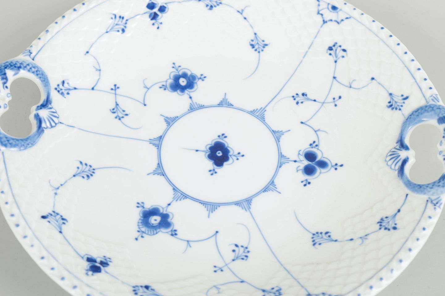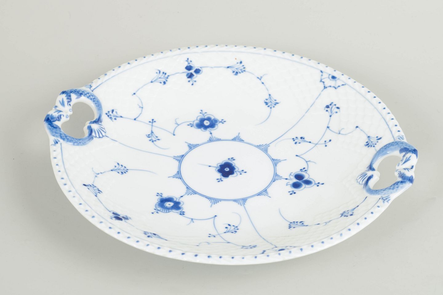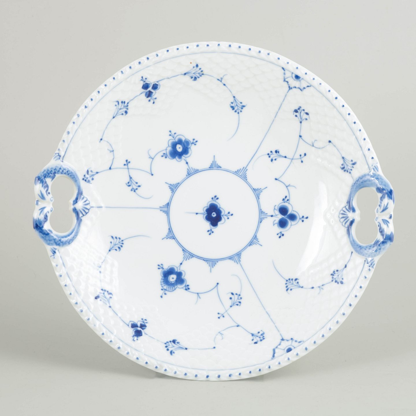 Round dish with two pierced handles in hand-painted porcelain with classic Blue Fluted underglaze decoration in cobalt blue. Model 101. First factory quality. Produced in the early 20th century.